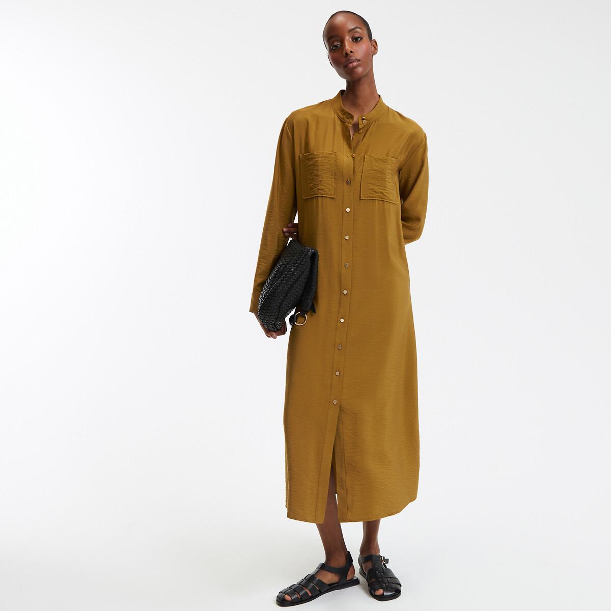 Dieses gerade lange Kleid bietet einen zeitlosen und modischen Look. Es verfügt über einen Stehkragen und eine durchgehende Knopfleiste, die eine klassische und doch moderne Silhouette schafft. Das Kleid ist mit langen Ärmeln und zwei Brusttaschen ausgestattet, die sowohl Stil als auch Funktionalität bieten. Ein Bindegürtel an der Taille und goldfarbene Knöpfe runden das elegante Erscheinungsbild dieses Modells ab.