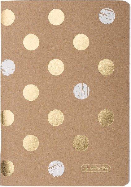 Notizheft A6 Bei diesem Look sorgen naturbelassene Papiere für ein sinnliches Feeling. Mit den gold-metallisch schimmernden Punkten als Kontrastakzente kommt Spannung in das puristische Design. Auch die Farbpalette gibt sich bescheiden und wird nur durch ein edles Weiß komplettiert. holzfreies Papier, 70g/m² weiß, 32 Blatt, abgerundete Ecken, liniert