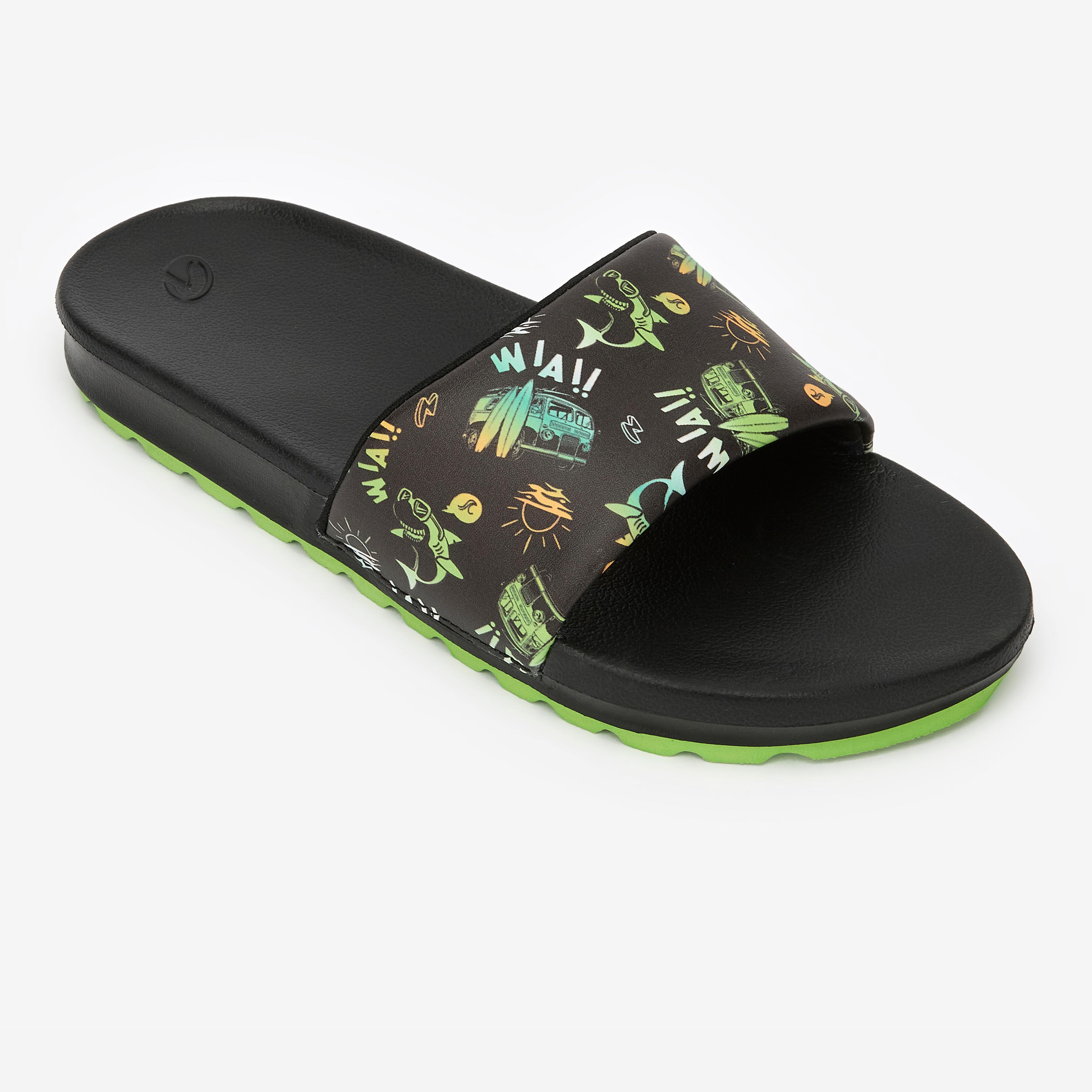 Diese Badesandalen für Jungen verfügen über einen bequemen Riemen mit einem verspielten Grafikdruck. Das konturierte Fussbett bietet Halt, während die strukturierte Sohle auf nassen Oberflächen guten Grip gewährleistet. Die leuchtend grüne Sohle verleiht dem Gesamtdesign einen Farbtupfer.