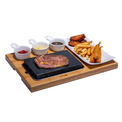 7-teiliges Hot Stone Set 1x Lava Stein - 20.3 x 13.3 x 3 cm 1x Edelstahl Platte 3x Keramik Schalen 1x Keramik Platte 1x Serviertablar aus Bambus Masse: 40 x 28 x 3 cm Material: Lava Stein, Edelstahl, Keramik, Bambus