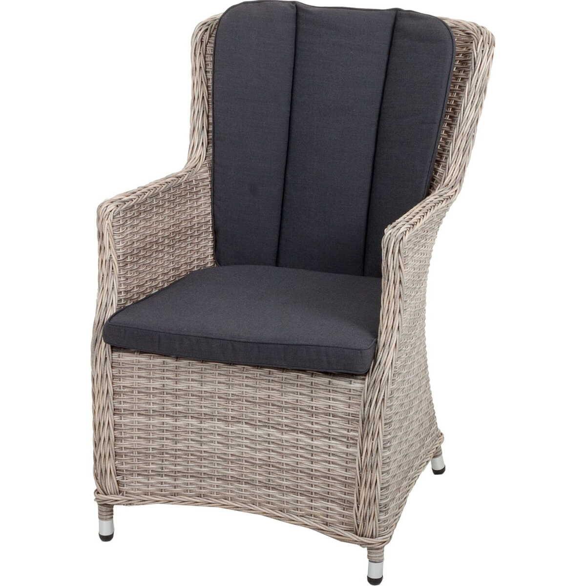 Elegantes und modernes Design Hergestellt aus hochwertigem grauem Aluminium Dekorative Kappen und flaches, sesamgraues Kunststoffgeflecht Geschwungene Rückenlehne für erhöhten Sitzkomfort Bequeme schwarze Auflage, ideal für längere Sitzsessions Robuste und wetterbeständige Konstruktion Maximale Belastbarkeit von 120 kg Perfekt für Garten, Terrasse oder Balkon