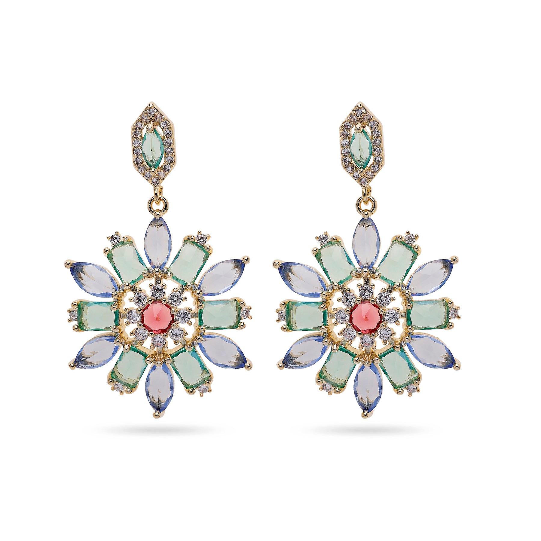 Diese farbenfrohen Ohrhänger in Blütenform bestechen durch ein buntes Arrangement aus edelsteinähnlichen Blütenblättern, die einen zentralen roten Stein umgeben. Sie hängen an einer goldfarbenen Fassung mit funkelnden Akzenten. Größe: 2,6 cm x 4,3 cm | Beschichtung: Vergoldet | Verschluss: Stecker und Rückteil
