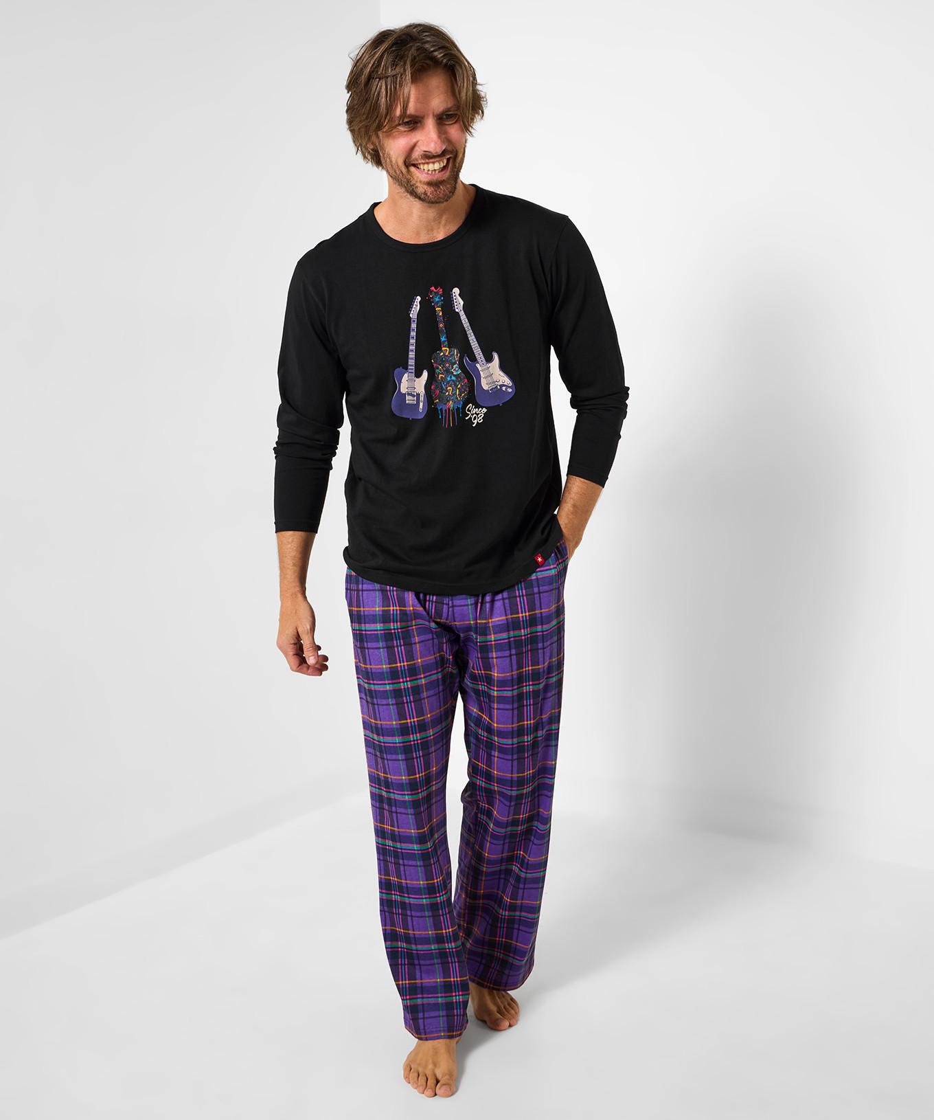 Dieses Pyjama-Set besteht aus einem langärmeligen Oberteil mit Rundhalsausschnitt und einem lebhaften Musikmotiv, kombiniert mit bequemen karierten Hosen. Das Oberteil zeigt drei Gitarren mit farbigen Details, die dem Design eine verspielte Note verleihen. Die Hose ist mit einem klassischen Karomuster in Lila-, Blau- und Grüntönen gestaltet und bietet eine entspannte Passform für ultimativen Komfort.
