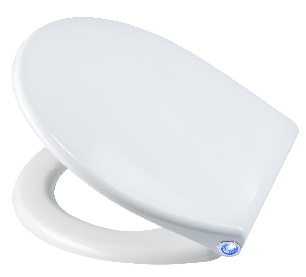diaqua® WC-Sitz Perth LED Slow Down weiss 40-45.5 X 37.5 CM 19 - WC-Sitz mit Absenkautomatik für sanftes Schliessen von Deckel und Brille (Slow Down), Einknopfdrucktechnik mit praktischer Betätigung, zum Reinigen einfach abnehmbar (Easy Cleaning Push). Rasche Montage durch verstellbare und einfache Befestigung, aus pflegeleichtem und langlebigem Duroplast, universelle Passform für alle handelsüblichen WC-Anlagen, inkl. Befestigungsmaterial. LED-Beleuchtung im Deckel. Licht schaltet durch Audiosensor und nur bei Dunkelheit ein und leuchtet ca. 2 Minuten.