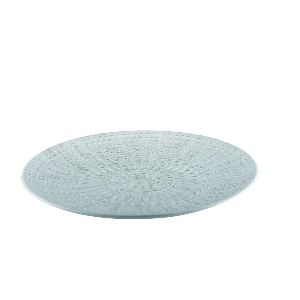 Runder Teller mit einem Durchmesser von 45 cm, aus weißem Holz mit rustikalen Motiven