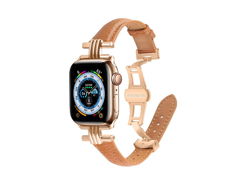 Dieses Armband für die Apple Watch 38/40/41mm ist aus genarbtem Kunstleder gefertigt, um Eleganz und Haltbarkeit zu gewährleisten. Sein schlankes und elegantes Design passt sich optimal an Ihr Handgelenk an. Das Armband ist mit einer Faltschließe ausgestattet, die eine einfache und sichere Anpassung ermöglicht. Das Armband lässt sich mit Hilfe des integrierten Adapters leicht anbringen und abnehmen.