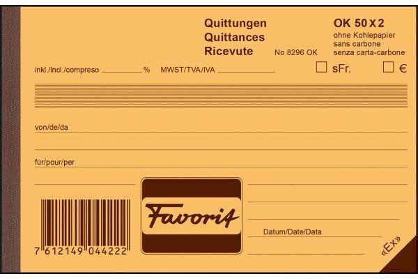 Quittungen OK 3-sprachig D/F/I Das Quittungsformular von FAVORIT ist das passende Formular, um Verkäufe/Einkäufe schnell und exakt zu dokumentieren. Selbstdurchschreibende Direktkopie Ohne Kohlepapier