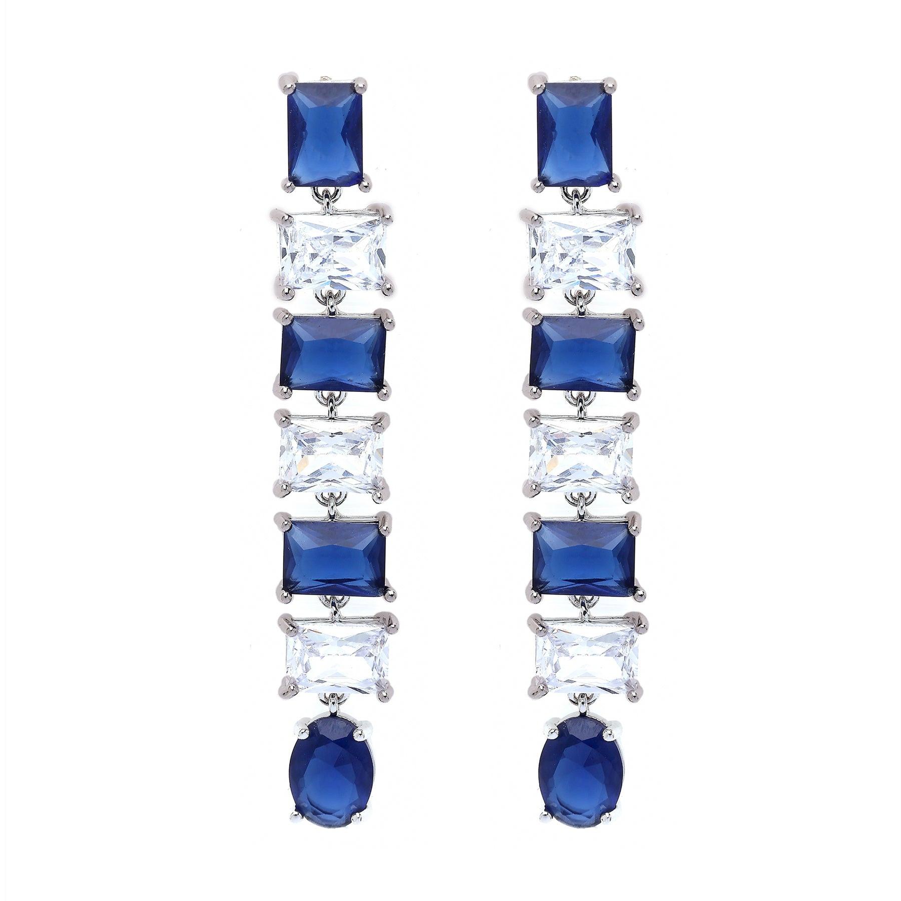 Ein elegantes, geradliniges Design mit abwechselnd tiefblauen und klaren Edelsteinen. Die satten Saphirtöne bilden einen wunderschönen Kontrast zu den funkelnden, klaren, rechteckig geschliffenen Steinen, die in silberfarbenem Metall gefasst sind. Ihr strukturierter, raffinierter Look macht sie zum perfekten Accessoire für formelle Anlässe und Abendgarderobe und verleiht jedem Outfit einen Hauch von Eleganz und Luxus. Größe: 0,7 cm x 5,2 cm | Beschichtung: Rhodiumplattiert | Verschluss: Stecker und Rückseite