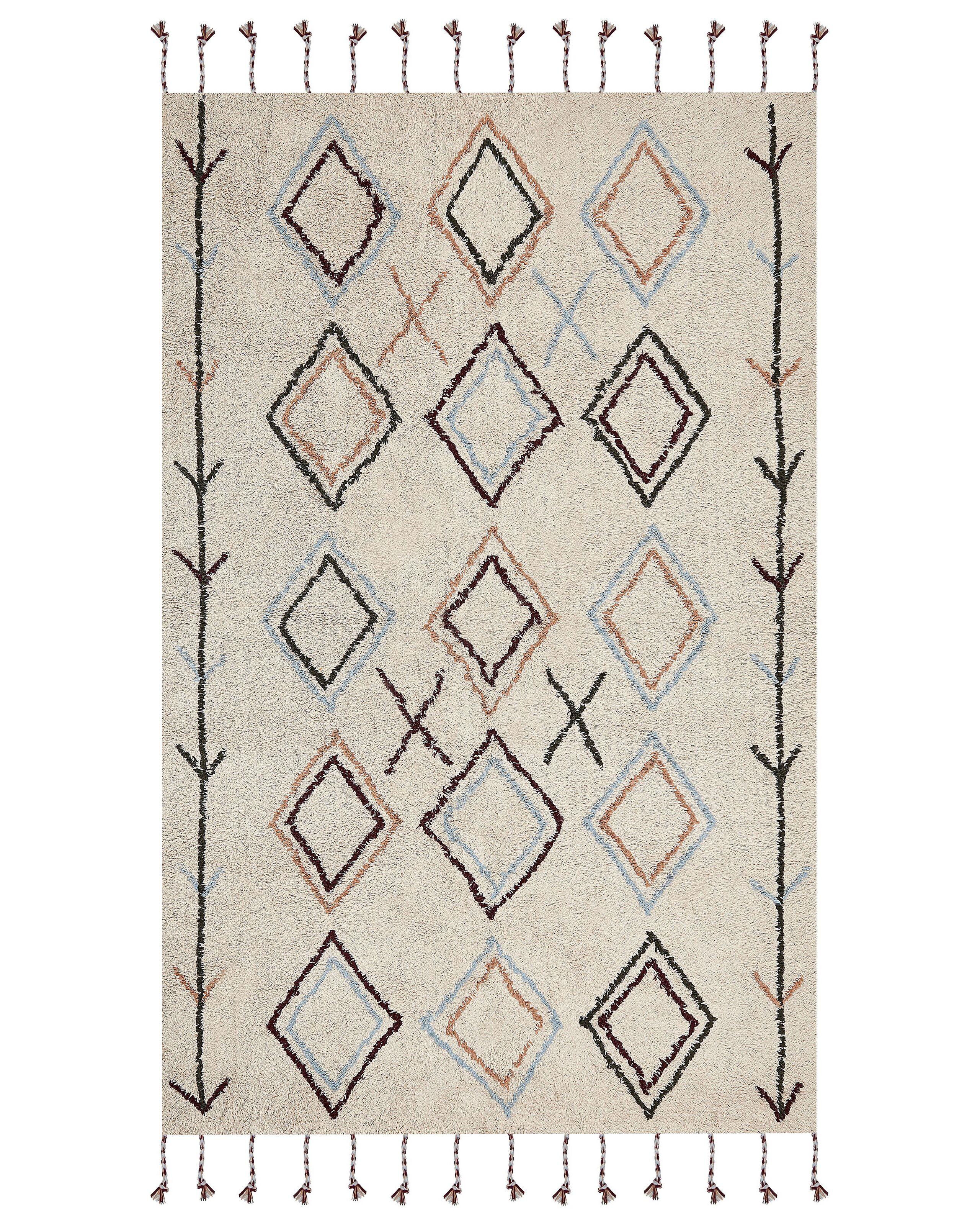 Handgetufteter Teppich mit mehrfarbigem Muster im Boho-Stil. Dieser Teppich mit farbenfrohem Muster ist ein einzigartiges Dekorationsstück, das einen Boho-Touch in Ihr Wohn- oder Schlafzimmer bringen wird. Der handgetuftete Baumwollteppich ist ausserordentlich weich und sieht am besten neben dem Bett oder Sofa platziert aus. Die Quasten an den Seiten betonen den Boho-Stil des Teppichs, während die Farbkombination zu verschiedenen Einrichtungsstilen passt.