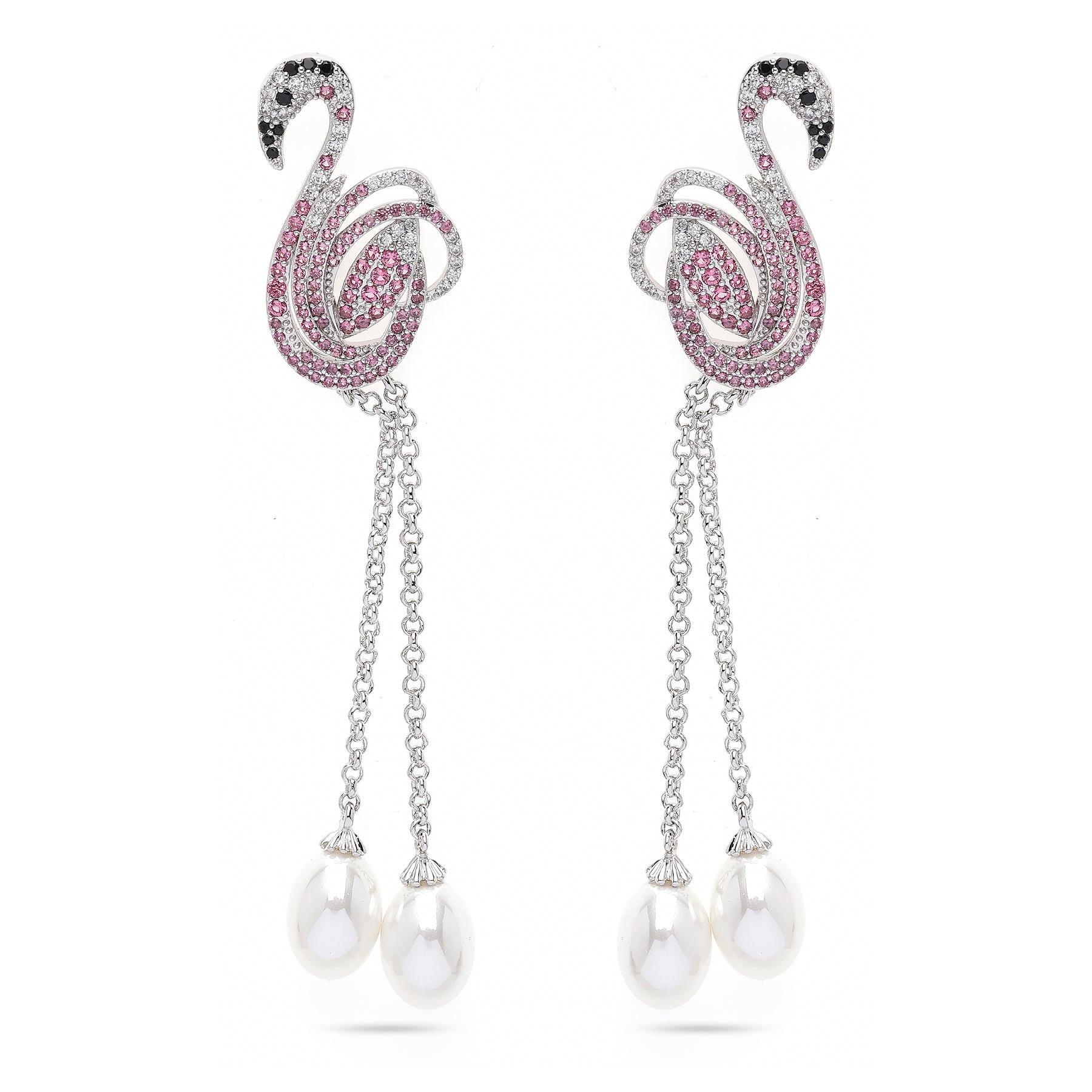 Diese atemberaubenden, schwanenförmigen Ohrringe verströmen Eleganz und Anmut! Das filigrane Design besticht durch schimmernde rosa Steine, die den Körper des Schwans bilden, während zarte Silberketten mit glänzenden, perlenartigen Anhängern daran herabhängen. Die perfekte Wahl für einen raffinierten und stilvollen Look! Größe: 1,7 cm x 7,7 cm | Beschichtung: Rhodiumplattiert | Verschluss: Stecker und Rückseite