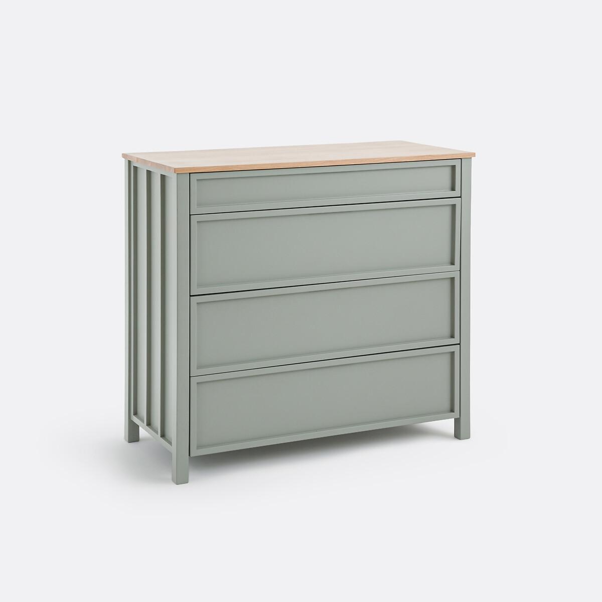 Die in einer sanften Farbe gehaltene Kommode Eugène mit 4 Schubladen gefällt mit origineller Optik und Landhaus-Flair. Design by La Redoute Intérieurs.