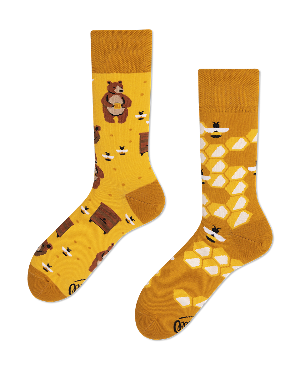 Diese verspielten Socken von Many Mornings zeigen ein charmantes Honigbären- und Wabenmuster. Eine Socke präsentiert einen Bären, der einen Honigtopf hält, umgeben von Bienen und Bienenstöcken, während die andere Socke ein lebhaftes Wabenmuster mit Bienen aufweist. Die kontrastierenden Designs an jedem Fuss verleihen jedem Outfit eine einzigartige und lustige Note.