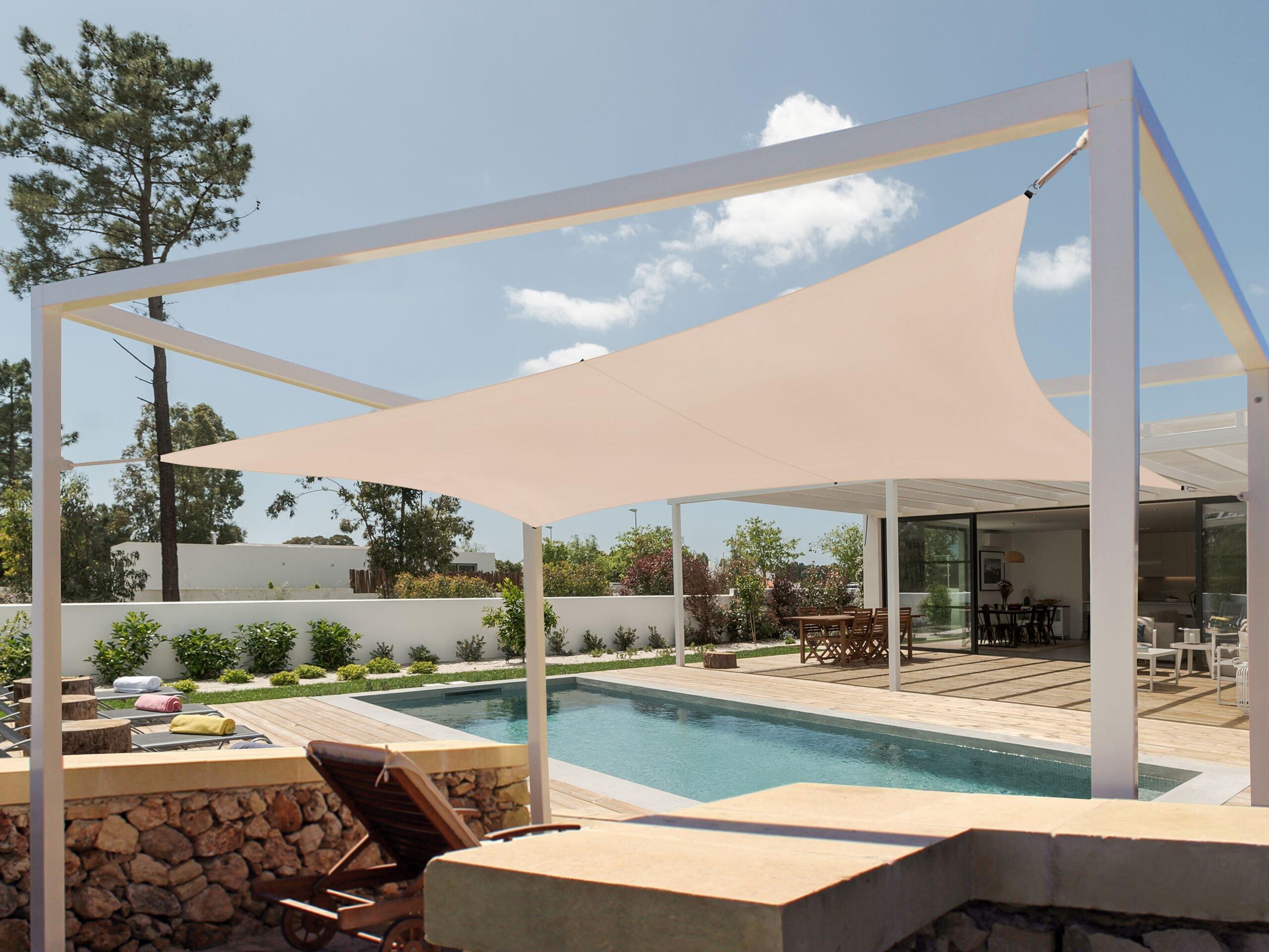 Modernes, konkaves Viereck Schattensegel in Cremeweiss. Die Bespannung punktet nicht nur mit dem hellen Farbton, der sich harmonisch in das Gesamtbild Ihres Aussenbereichs einfügt. Sie ist auch aus einem langlebigen, robusten Polyesterstoff mit verstärkten Randsäumen und einer Kunststoffbeschichtung gefertigt, die zusätzlich seine UV-Beständigkeit steigert. So bietet das Segel optimalen Sonnenschutz über der Terrasse, auf dem Balkon oder im Garten. Dank den galvanisierten Metall-D-Ringen und Karabinern ist das Modell einfach an den Mast oder die Wand montierbar. Die 4 zusätzlichen Führungsseile halten das Material glatt gespannt, so kann es auch etwas stärkeren Windböen standhalten.
