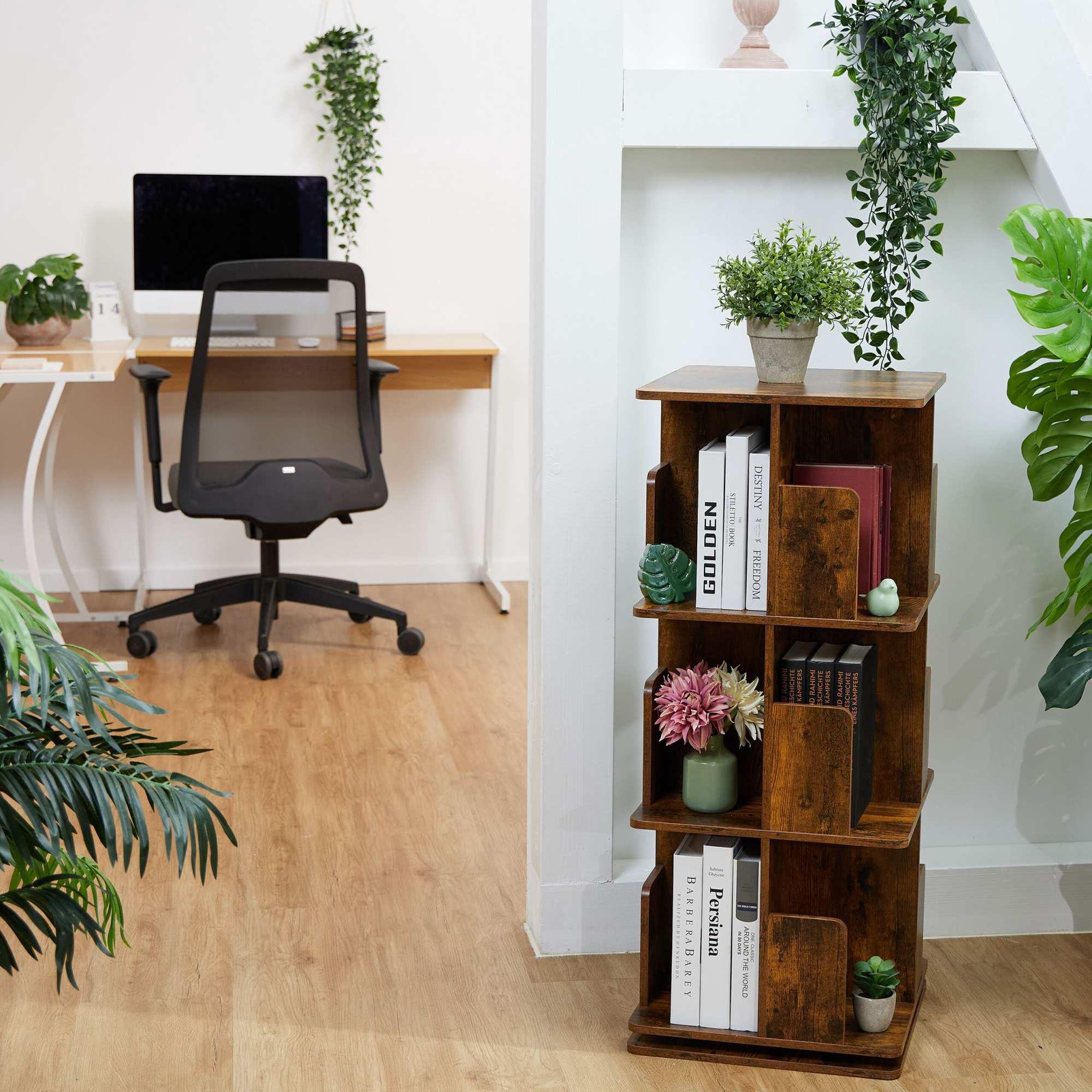Das Bücherregal im Industriedesign lässt sich um 360 Grad drehen und bietet so einfachen Zugriff. Es ist eine vielseitige Aufbewahrungslösung für Bücher, CDs und Deko. Dank seines kompakten Designs passt es perfekt in kleine Räume.