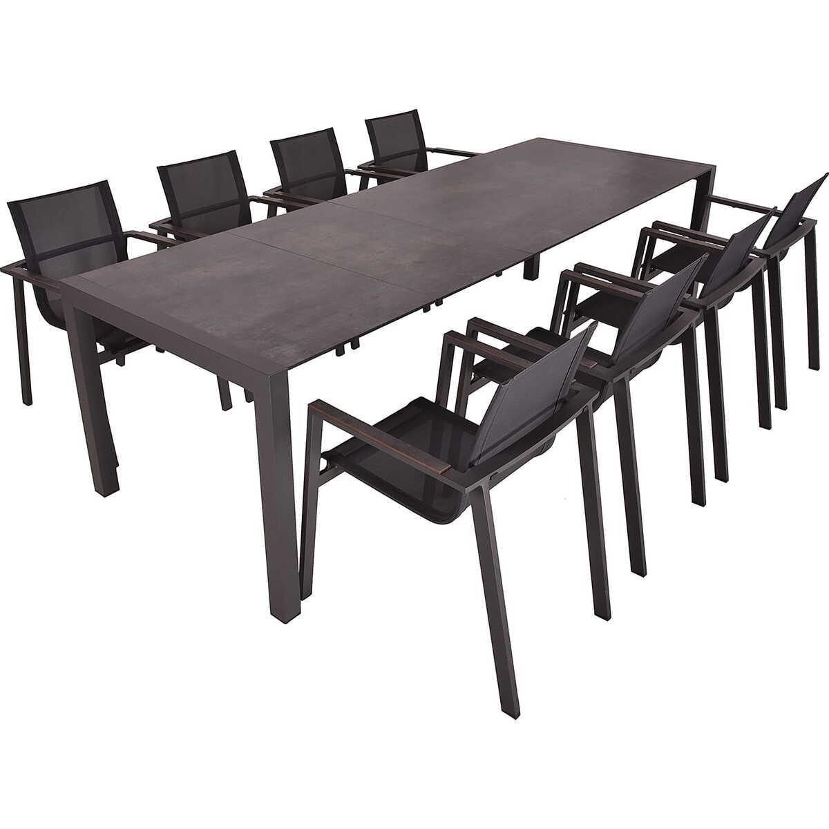 Die Tischgruppe Sophia ist eine innovative Fusion aus Funktionalität und prägnantem Design. Mit seiner robusten Konstruktion aus pfefferschwarzem pulverbeschichteten Aluminium und einer dunkelbraunen Kunststoff HPL-Tischplatte in Grau, garantiert der ausziehbare Sophia Tisch Beständigkeit und Stil. Ergänzt wird das Set durch acht Stapelstühle aus dem gleichen langlebigen Material, die eine komfortable und moderne Sitzlösung für Ihre Outdoor-Mahlzeiten darstellen. Die Tischgruppe Sophia ist mehr als nur ein Möbelstück - es ist das Herzstück eines jeden stilvollen Aussenbereichs, der Design und Langlebigkeit miteinander vereint.