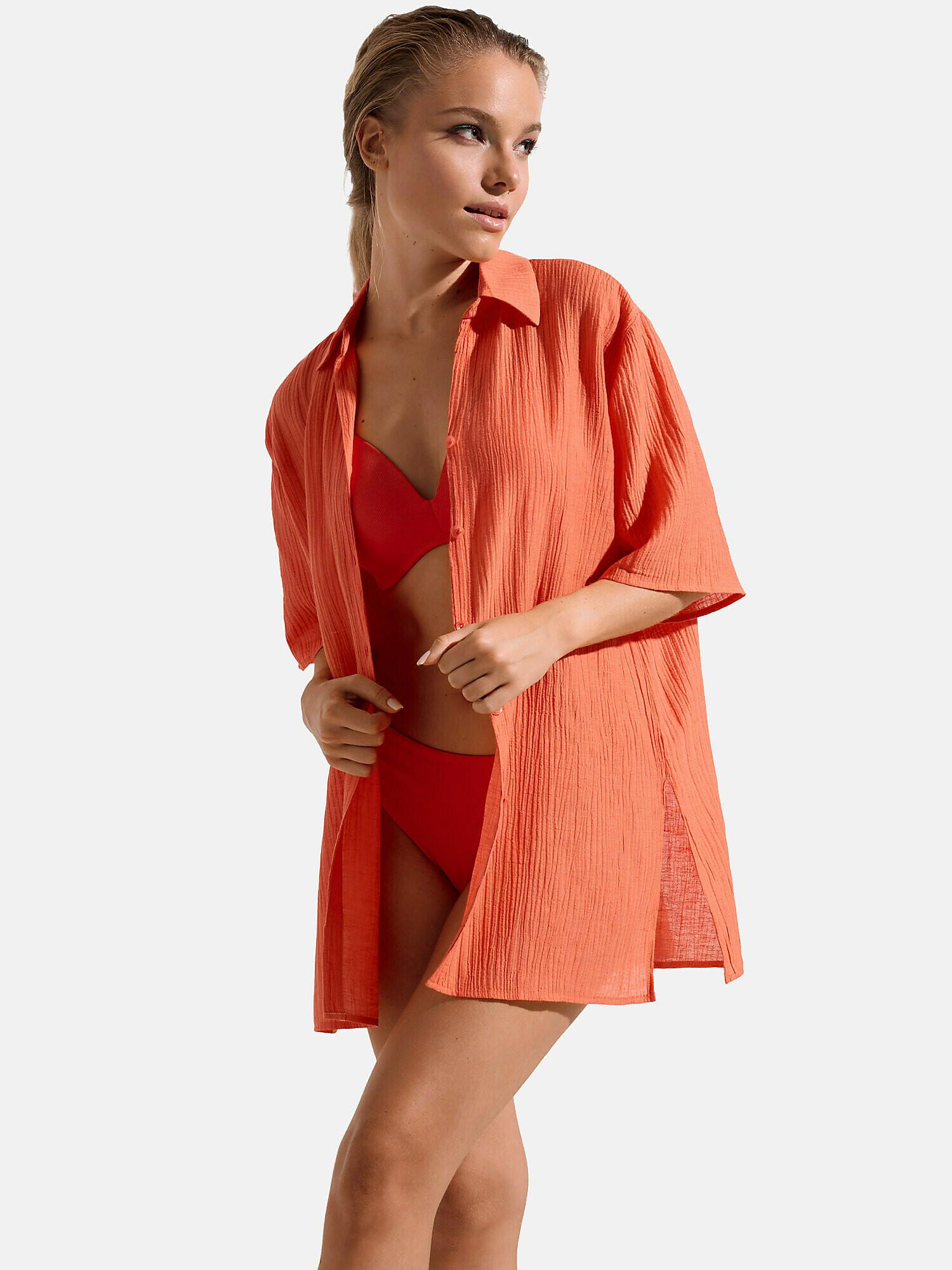 Tunika im leichten Blusenschnitt mit kurzen Ärmeln, die über einem Badeanzug getragen oder mit anderen Alltagsteilen kombiniert werden kann. Weite Bluse im Retrodesign mit Kragen, abgewinkelten Ärmeln und Knopfverschluss vorne. Länge ca. 80 cm.