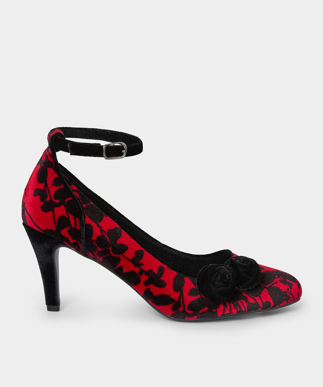 Diese roten Samtpumps sind die richtige Wahl, wenn der Dresscode Romantik verlangt. Sie verfügen über ein auffälliges Blumenmuster, das jedem Outfit Eleganz verleiht. Das Design umfasst einen Knöchelriemen für einen sicheren Halt und dekorative Elemente an der Spitze für zusätzlichen Charme.