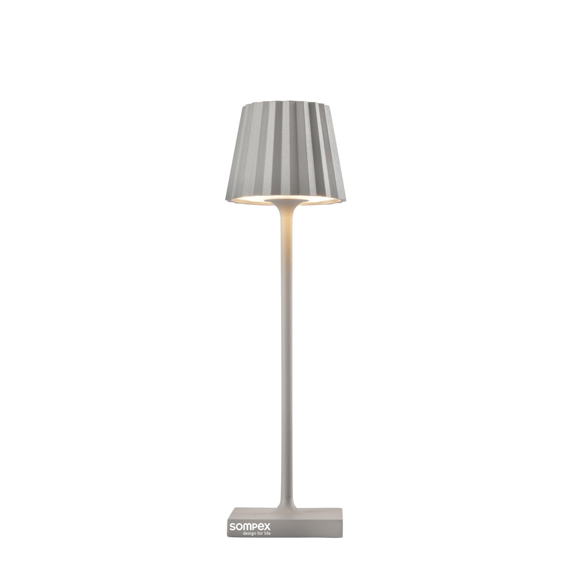 Die Troll Nano von Sompex ist eine vielseitige Akku-Tischleuchte für den Innen- und Außenbereich, die mit ihrem unverkennbaren Plissee-Schirm und ihrer langlebigen Aluminiumkonstruktion überzeugt.Innen- und Outdoor-EinsatzLange Akkulaufzeit von bis zu 52 StundenStufenlose Dimmung über Touch-SensorZwei warmweiße Lichtfarben wählbarSchnelles Aufladen über mitgelieferte LadestationDie Troll Nano von Sompex vereint stilvolles Design mit praktischer Funktionalität. Gefertigt aus robustem Aluminium und in verschiedenen Farben erhältlich, fügt sich die Troll Nano nahtlos in jedes Ambiente ein und kann sowohl drinnen als auch draußen genutzt werden. Dank ihres leistungsstarken Akkus bietet sie bis zu 52 Stunden kabelloses Licht, was sie ideal für den Einsatz in verschiedenen Bereichen macht.Mit dem Touch-Sensor auf der Oberseite der Leuchte lässt sich die Helligkeit der Troll Nano stufenlos dimmen und zwischen zwei warmweißen Lichtfarben wählen. Dadurch kann die Beleuchtung an die individuellen Bedürfnisse und die gewünschte Atmosphäre angepasst werden. Nach Bedarf kann die Troll Nano über die mitgelieferte Ladestation schnell und unkompliziert wieder aufgeladen werden, sodass sie stets einsatzbereit ist. Mit einem Durchmesser von 6 cm und einer Höhe von 21 cm ist sie kompakt und platzsparend und eignet sich perfekt als flexible Lichtquelle für unterschiedliche Situationen. Video