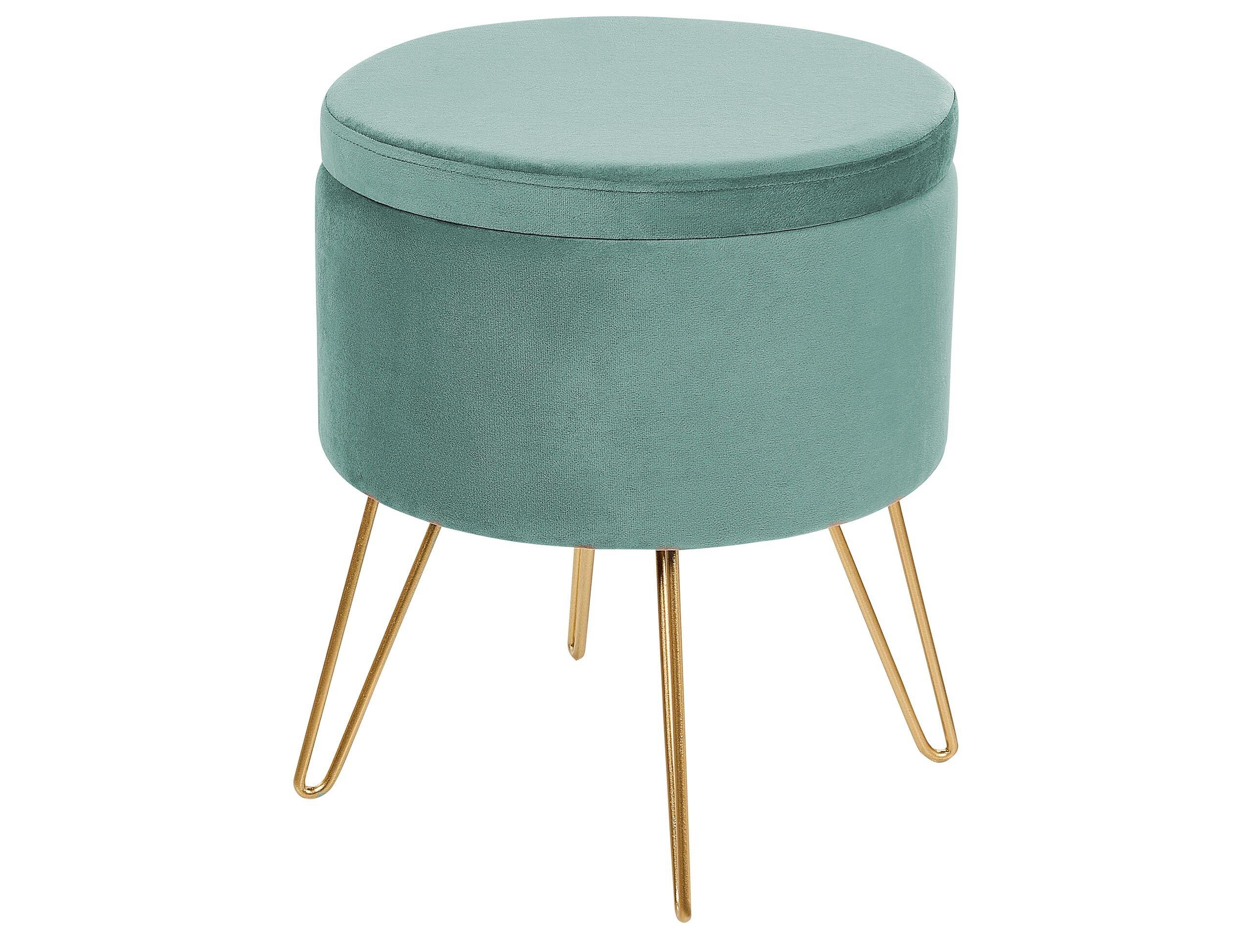 Runder Hocker mit Stauraum und goldenen Beinen. Eleganz und Funktionalität, die sich sehen lassen. Mit diesem eleganten Polsterhocker setzen Sie ein Statement in Ihren Wohnräumen und sorgen dabei auch noch für Ordnung. Er ist mit einem geschmeidigen Bezug aus Samtstoff versehen, der sich nicht nur mit seiner angenehmen Haptik, sondern auch mit seinem dezenten Schimmer auszeichnet. Seine goldenen Metallbeine unterstreichen seine luxuriöse Optik und verleihen jedem Wohnraum zusätzliche Raffinesse. Unter dem gepolsterten Deckel verbirgt sich ein geräumiger Stauraum, in dem Sie Ihre Kleinigkeiten aufbewahren können. Zudem ist der Samthocker sehr leicht zu transportieren, so ist schnell ein zusätzlicher Sitzplatz im Flur, Salon, Schlaf-, Gäste- oder Wohnzimmer herbeigezaubert.