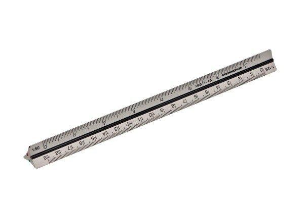 Aluminium-Dreikantmassstäbe Schlanker Dreikantmaßstab aus Aluminium mit drei farbigen Hohlkehlen, Präzisionsteilungen und markanter Vorbezifferung.