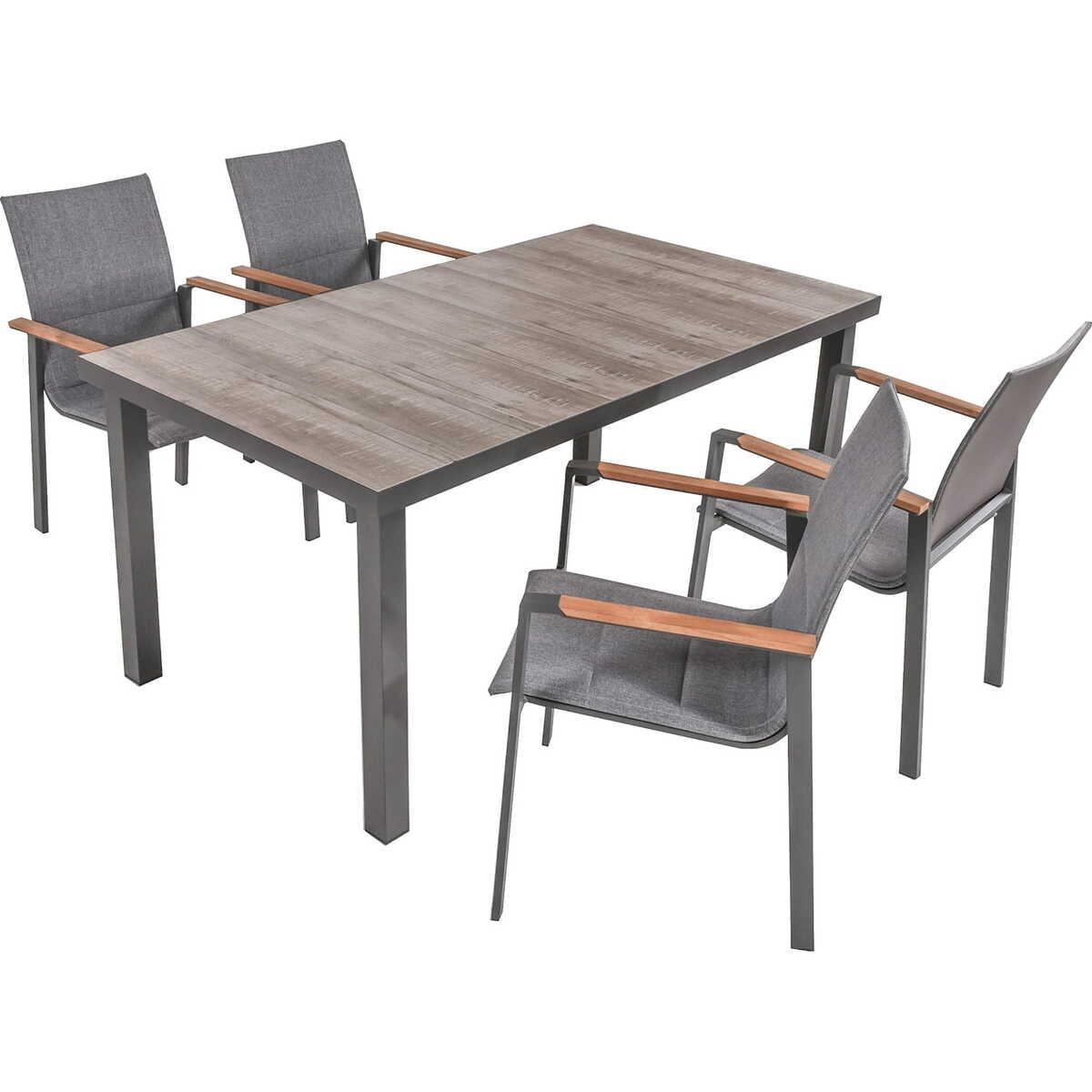 Modernes und elegantes Design Hochwertige Materialien für Langlebigkeit Keramik-Tischplatte in Eiche-Optik für natürliche Ästhetik Stapelbare Stühle für einfache Lagerung Pulverbeschichtetes Aluminium für erhöhte Haltbarkeit Teakholz-Armlehnen für zusätzlichen Komfort Perfekt für Innen- und Aussenbereiche Maximale Belastbarkeit: Stuhl - 165kg, Tisch - 50kg