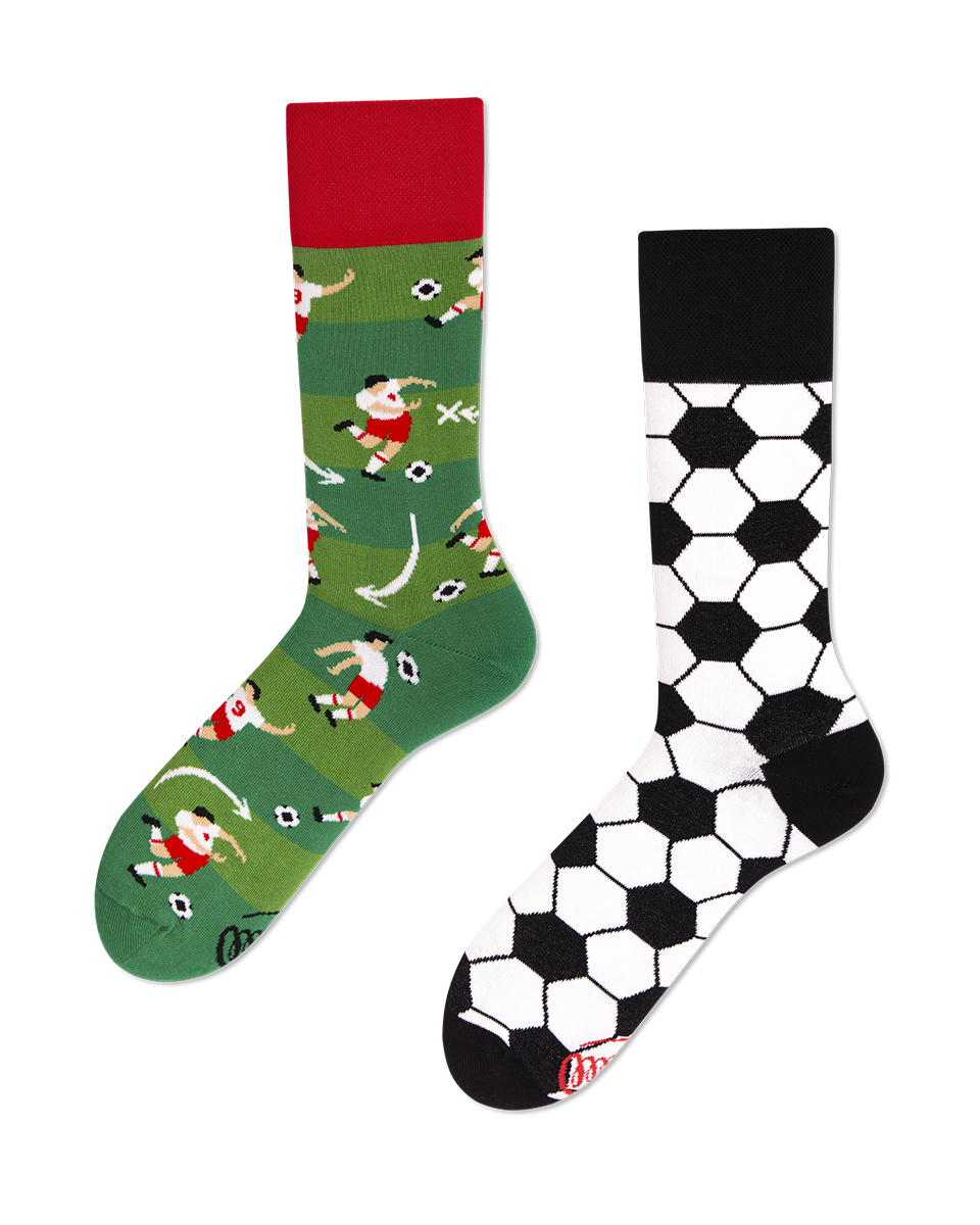 Diese Football Fan Socken sind für Komfort und Stil konzipiert, perfekt für jeden Fussball-Enthusiasten. Das Set enthält zwei nicht zusammenpassende Socken, eine mit einem leuchtend grünen Hintergrund und Fussballspielern in Aktion, die andere mit einem klassischen schwarz-weissen Fussballmuster.