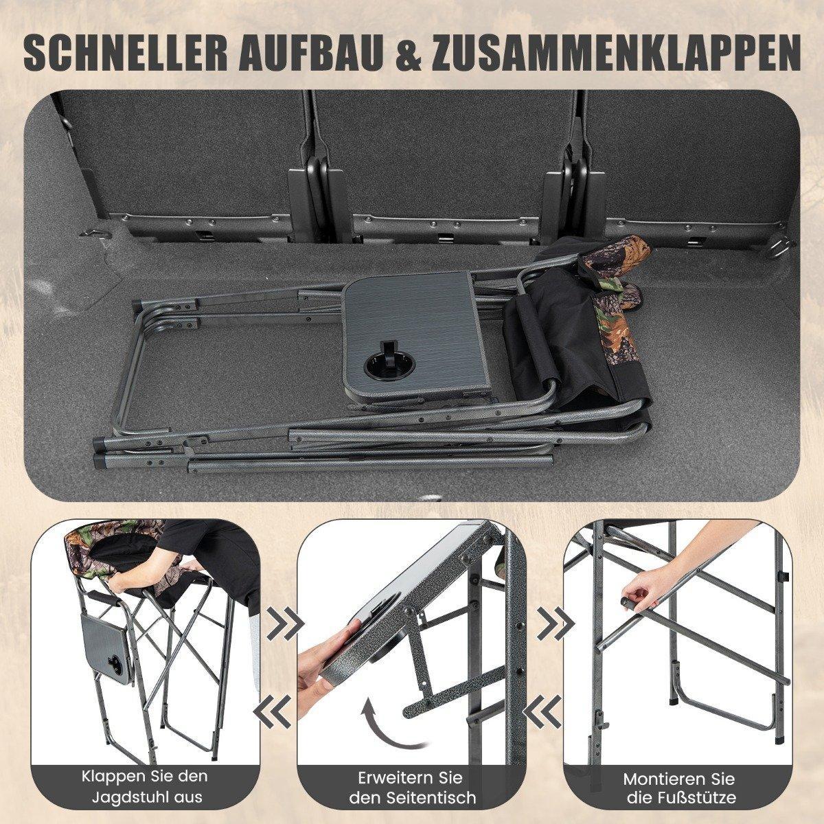 Eines der herausragenden Merkmale dieses Jagdstuhls ist sein klappbarer Beistelltisch, der einen praktischen Platz für Ihre wichtigsten Utensilien wie Ferngläser, Munition oder Jagdwaffen bietet. Der angebrachte Getränkehalter sorgt dafür, dass Ihre Getränke immer griffbereit sind. Dieser Jagdstuhl ist mit einem robusten Metallrahmen ausgestattet und auf Langlebigkeit ausgelegt. Die Beine sind mit einer X-förmigen Struktur verstärkt und sorgen so für Stabilität auch auf unebenem Gelände. Klappen Sie einfach den Stuhl auf, ziehen Sie den Beistelltisch aus und befestigen Sie die Fußstütze, um einen vielseitigen Campingstuhl zu erhalten, der sich perfekt für verschiedene Anlässe wie Wandern, Camping, Picknicks und Jagen eignet.