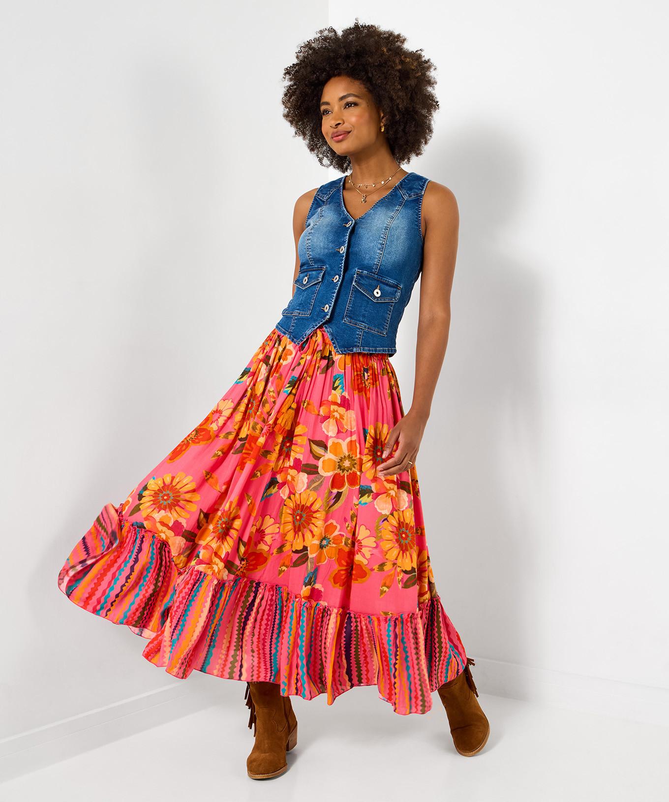 Das Bordürenmuster und der fließende Schnitt machen diesen Maxirock zu einem sommerlichen Begleiter.