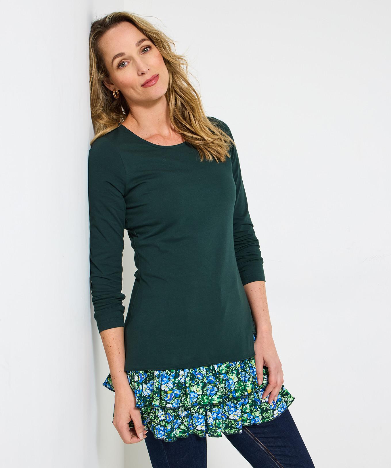 Dieses gemütliche Langarm-Tunika-Top ist genau das Richtige für ein bequemes Herbst-Outfit. Das Oberteil verfügt über einen einfarbigen oberen Bereich und einen lebhaften, gestuften Rüschensaum mit Blumenmuster, der einen Hauch von verspielter Eleganz verleiht.