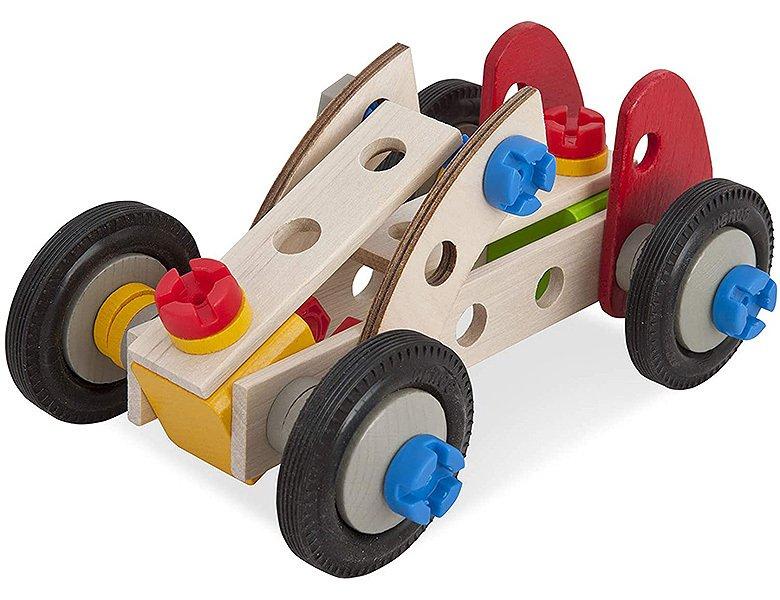 Mit diesem 50-teiligen Konstruktionsset können verschiedene Fahrzeugmodelle wie ein Rennauto, ein Minibuggy oder ein Formel 1 Auto gebaut werden. Alle notwendigen Werkzeuge sowie Montageanleitungen sind im Set enthalten. Die Holzteile und Verbindungselemente lassen sich einfach zusammensetzen, wobei auch eigene Kreationen möglich sind. Das Produkt fördert spielerisch die Feinmotorik und das räumliche Denken.