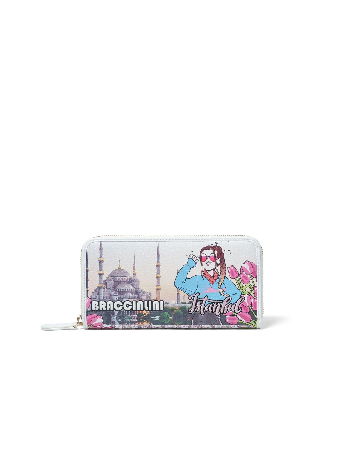 Die Evanthe Elite Brieftasche präsentiert einen lebendigen, von der Stadt Istanbul inspirierten Druck, der ikonische Wahrzeichen und ein verspieltes Design zeigt. Dieses stilvolle Accessoire ist für den täglichen Gebrauch konzipiert und bietet sowohl Funktionalität als auch eine einzigartige Ästhetik.