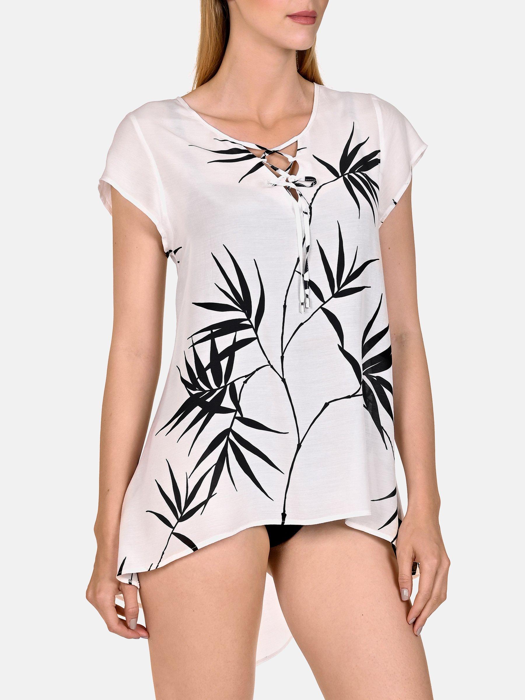 Fließende, bequeme Strandtunika mit kurzen Ärmeln und Schnürung am Halsausschnitt. Hergestellt aus einem bequemen Viskosegewebe ist sie ideal für warme Sommertage. Es ist mit eleganten Palmenblättern in Schwarz und/oder Weiß bedruckt. Aufgrund seiner Länge können Sie es als Sommerkleidung zu Ihren Hosen oder Röcken tragen. Im Rücken ist es etwas länger geschnitten. Eine Schnürung im Rücken sorgt dafür, dass Ihre Silhouette betont wird. Länge der Tunika ca. 85 cm.