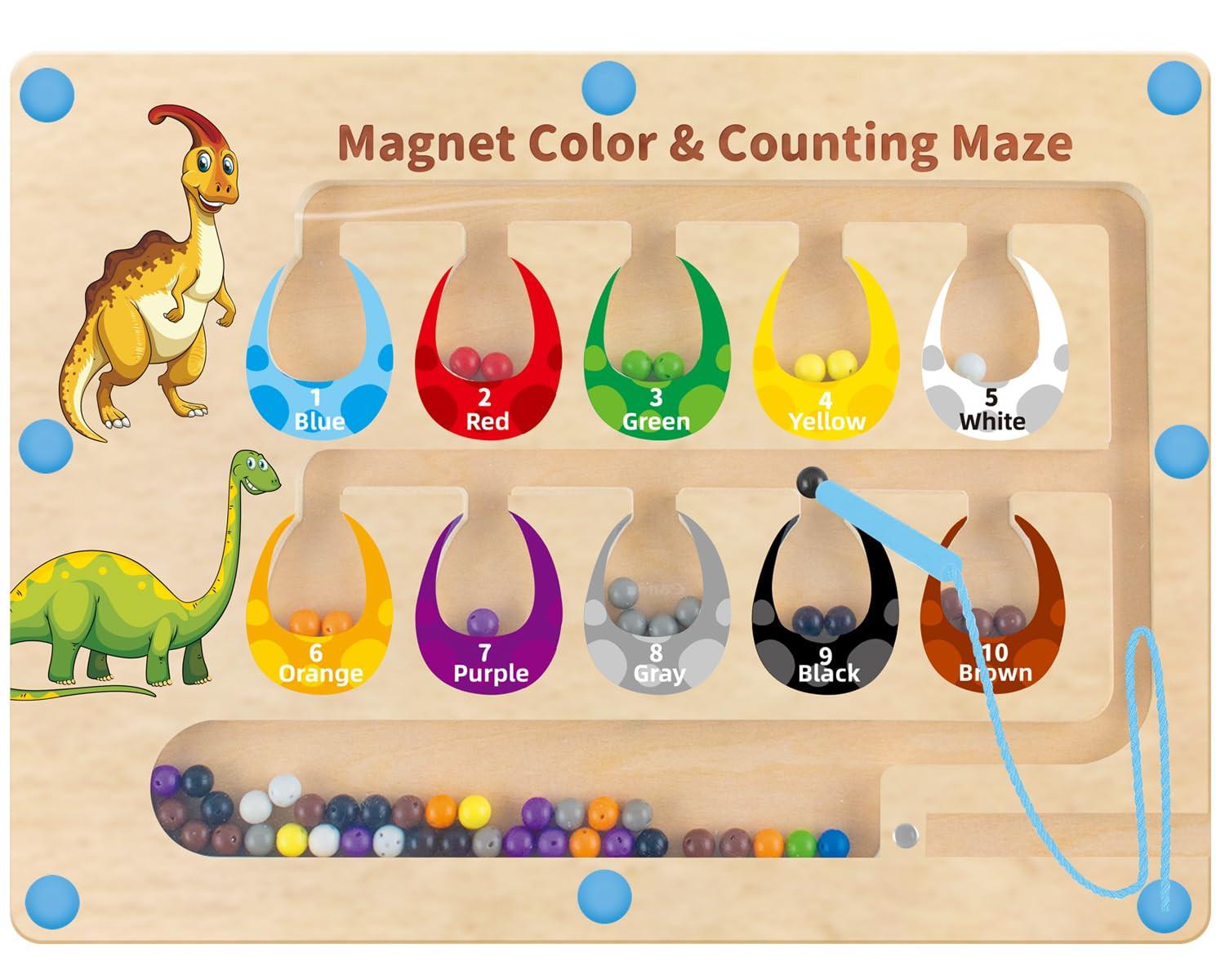 Farben und Zählen entdecken - Magnetisches Spiellabyrinth mit 10 eingebauten Dinosaurier-Eiern, die die Zahlen 1-10 darstellen, sowie 55 magnetischen Perlen in 10 leuchtenden Farben. Jede Dinosaurier-Ei-Farbe entspricht einer Zahl von 1 bis 10. Mit dem Magnetstab können die Kinder die Perlen in die Dinosaurier-Eier der entsprechenden Farben schieben, was die Hand-Augen-Koordination und die Geschicklichkeit schult und für stundenlangen Lernspaß sorgt. Magnete Lernspiele für Kinder ab 2 3 4 5 6 Jahren - Das motorische Holzspielzeug Activity Board ist ideal zum Lernen von Farben, Sortieren, Zahlenerkennung und Zählen. Das Holzspielzeug fördert die Feinmotorik, das Zählen und die Farberkennung Ihres Kindes sowie die Hand-Augen-Koordination, die räumliche Kontrolle, die Koordination und die Problemlösungsfähigkeiten. Es bietet eine hervorragende Möglichkeit für Kinder, spielerisch zu lernen und ihre kognitiven Fähigkeiten zu entwickeln. Perfektes Reisespielzeug; Geschenke - Das magnetische Spiellabyrinth hat ein kinderfreundliches Design, helle Farben, ist leicht und einfach zu tragen. Ideal für Schule, Outdoor-Aktivitäten, lange Autofahrten oder Flugreisen. Mit seiner exquisiten Verpackung ist es ein ideales Geschenk für Geburtstage, Thanksgiving, Weihnachten, Neujahr oder jeden anderen festlichen Anlass. Machen Sie Ihre Kinder glücklich und schenken Sie ihnen stundenlangen Lernspaß;Unterhaltung! Größe: 20х2х24cm