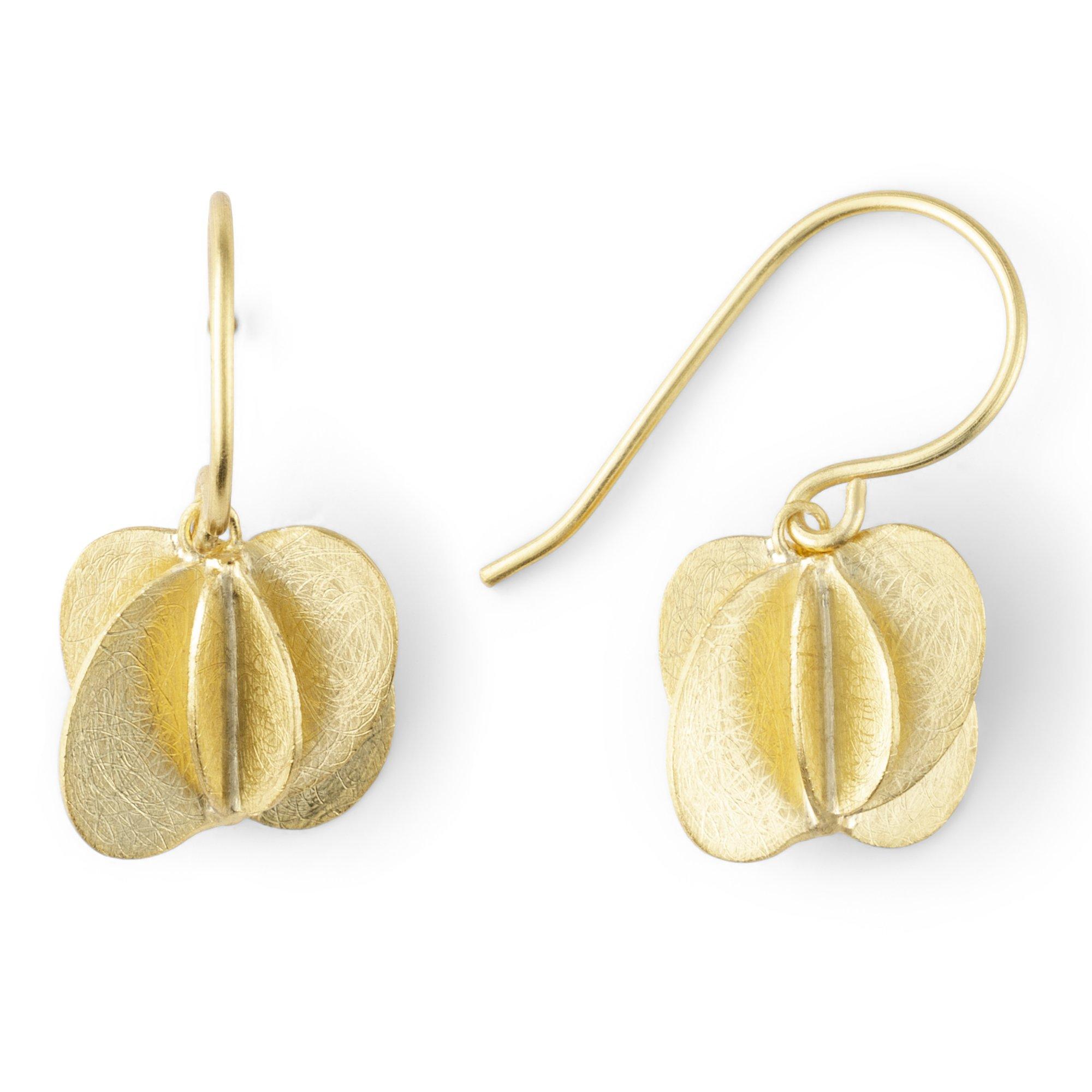 Blüte oder Samenkapsel, stilisierte Planetenbahnen oder abstraktes Gebilde: Was auch immer du in diesen Ohrhängern siehst, du wirst dich in sie schnell verlieben. Die feine Faltoptik und die eisgekratzte Oberflächenstruktur machen sie zu kleinen Kunstwerken mit handwerklichem Charakter. Die kunstvoll gearbeiteten Schmuckstücke eignen sich wunderbar als Geschenk. Die Geschenkverpackung gibt es gratis dazu.