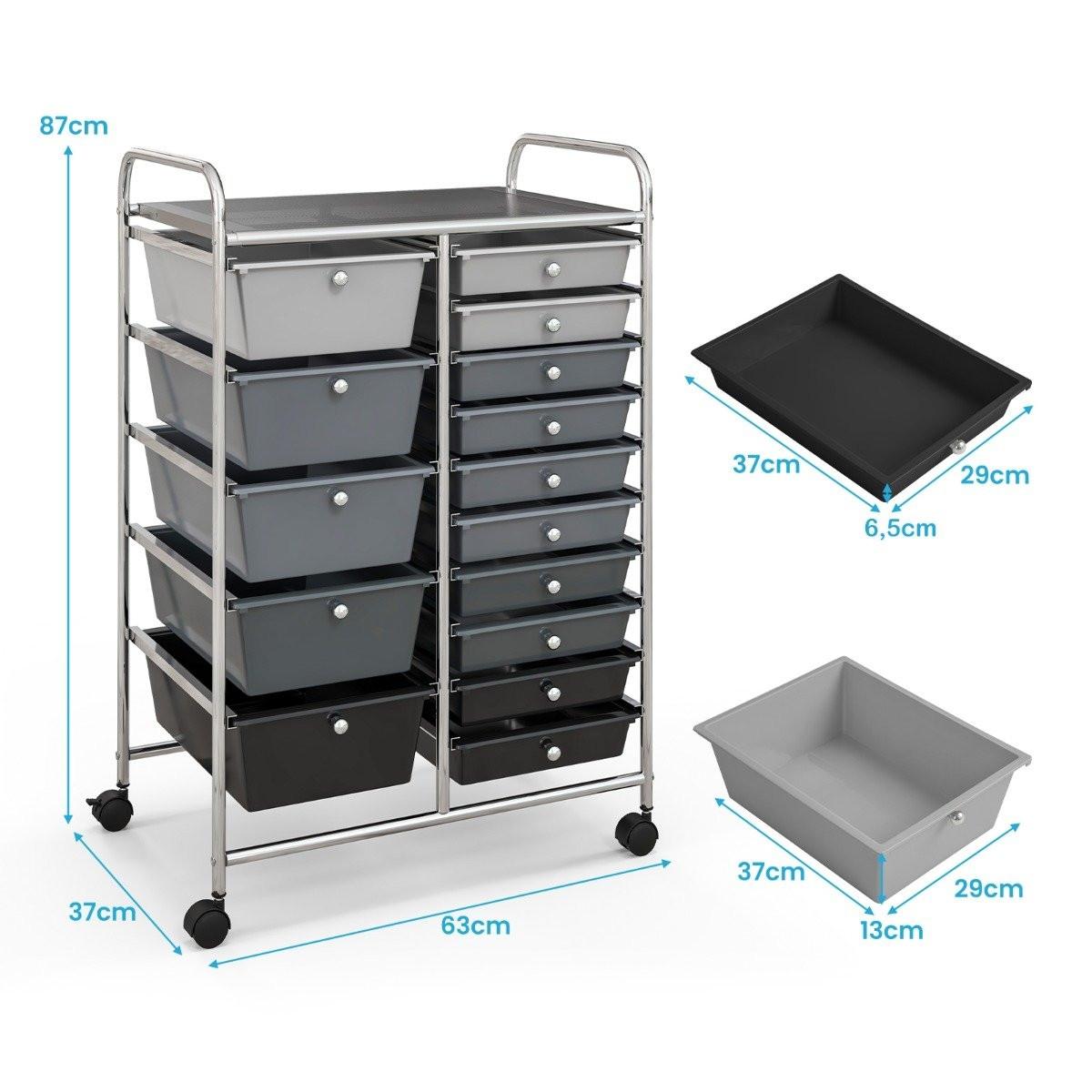 Verwandeln Sie Ihren Raum mit unserem eleganten und geräumigen Rollwagen, der sowohl Stil als auch Funktionalität in Ihr Zuhause oder Ihren Arbeitsplatz bringt. Diese vielseitige Aufbewahrungslösung verfügt über 15 herausnehmbare Schubladen, darunter 5 große und 10 mittelgroße Schubladen, die ausreichend Stauraum für alle Ihre Bedürfnisse bieten. Dieser Wagen besteht aus einem verzinkten/pulverbeschichteten Metallrahmen und robusten PP-Schubladen und ist auf Langlebigkeit ausgelegt. Die 4 Universalräder, davon 2 feststellbar, sorgen bei Bedarf für einfache Mobilität und Stabilität. Mit benutzerfreundlichen Funktionen wie schlanken Griffen und praktischen Knöpfen eignet sich dieser Wagen perfekt für die Organisation Ihres Wohnzimmers, Spielzimmers, Salons oder Ihrer Bastel- und Nähutensilien. Mit den Maßen 63 cm x 37 cm x 87 cm (L x B x H) spart dieser Mehrzweckwagen wertvollen Platz auf dem Boden.