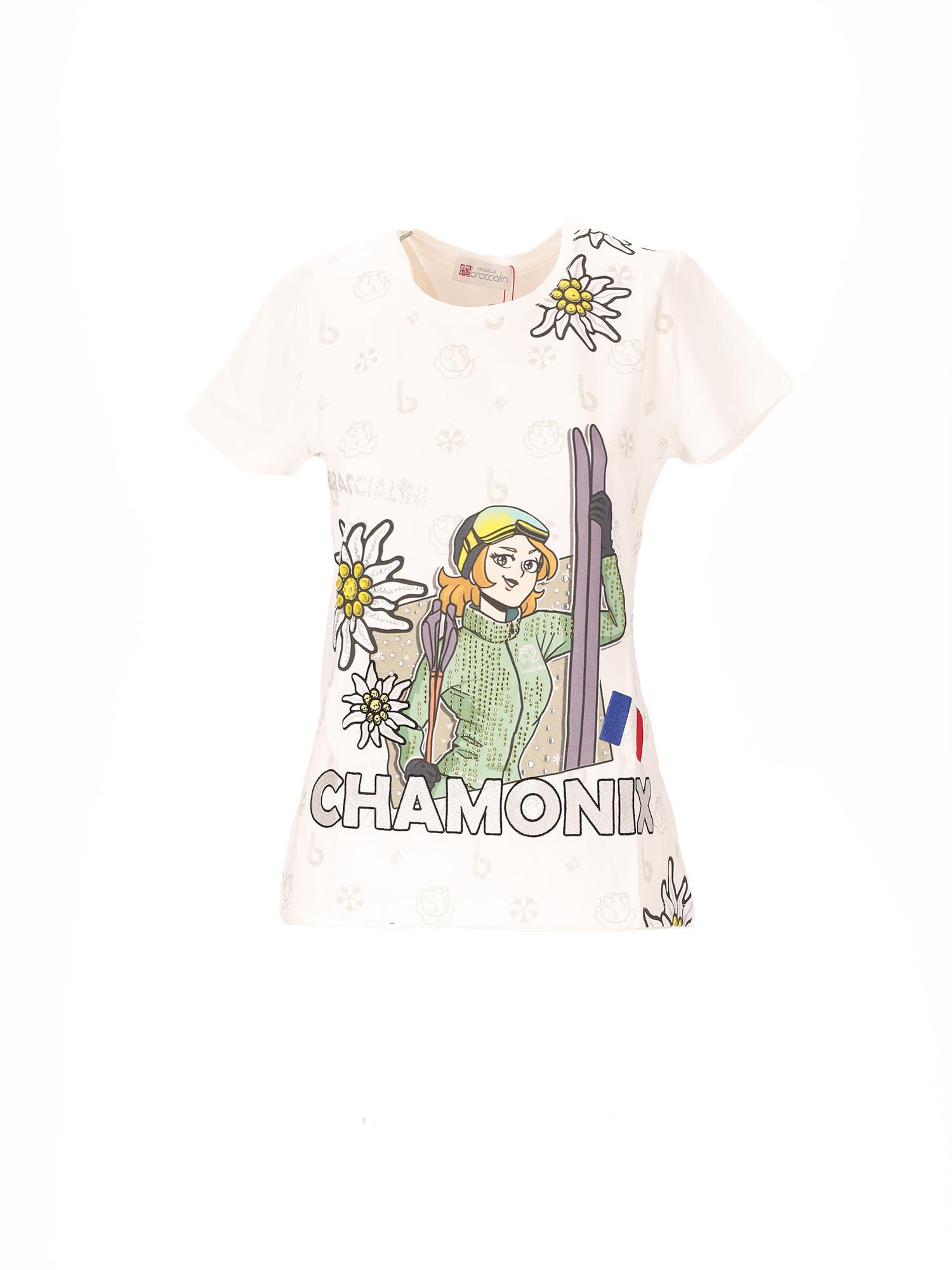 Dieses T-Shirt zeigt einen verspielten Print mit einem Skifahrer und dem Schriftzug „Chamonix“, was es zu einer charmanten Ergänzung für jede Freizeitgarderobe macht. Das Design wird durch subtile Blumenmotive und kleine „b“-Symbole ergänzt, die über den Stoff verteilt sind.