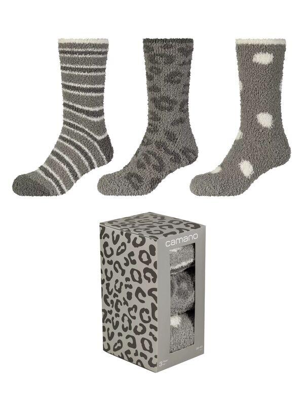 Dieser 3er-Pack Kuschelsocken bietet Wärme und Komfort. Jedes Paar weist ein anderes Muster auf, darunter Streifen, ein Tierdruck und Tupfen, die Abwechslung für den Alltag bieten. Diese Socken sind extrem flauschig, kuschelig und warm, nachhaltig hergestellt mit recycelten Fasern.