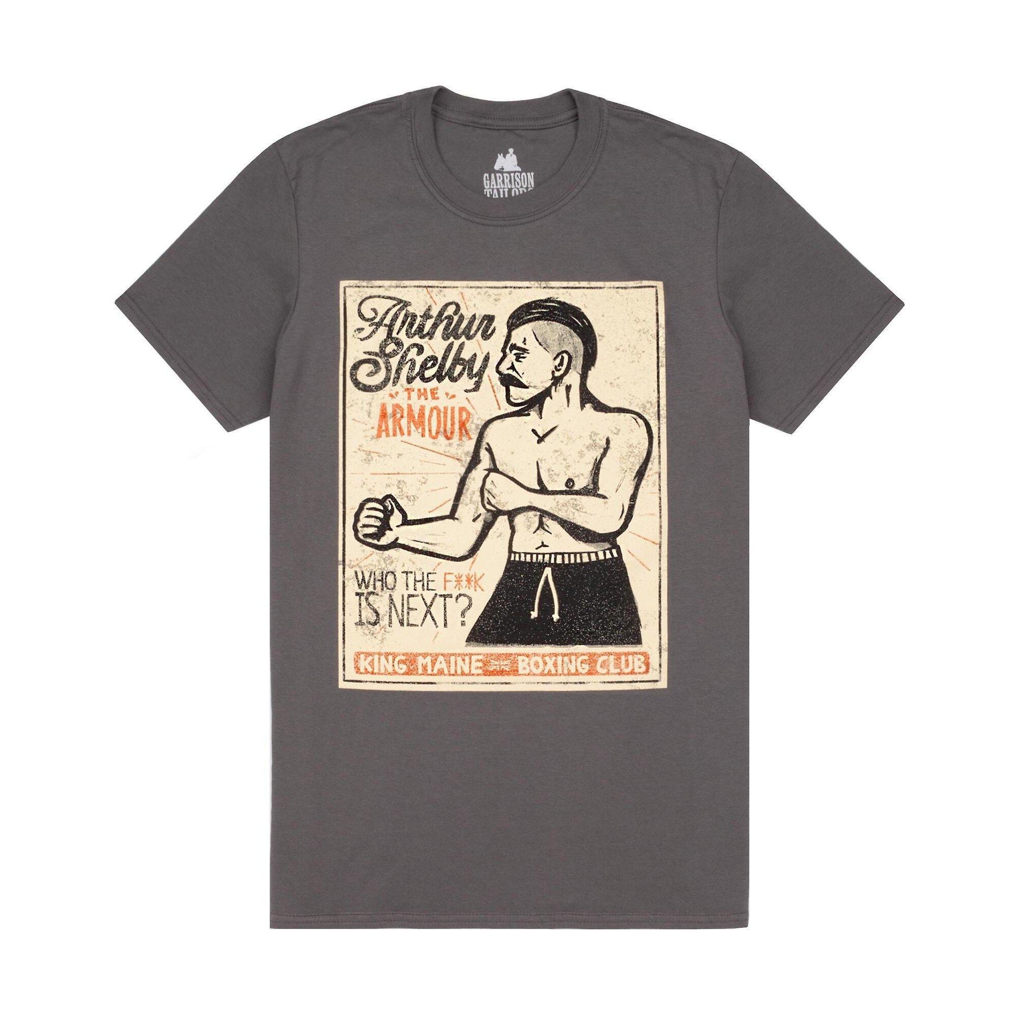 Dieses T-Shirt zeigt einen markanten Grafikdruck von Arthur Shelby, bekannt als "The Armour", vom King Maine Boxing Club. Das Design fängt eine Vintage-Boxposter-Ästhetik ein und ist eine einzigartige Ergänzung für jede Garderobe.