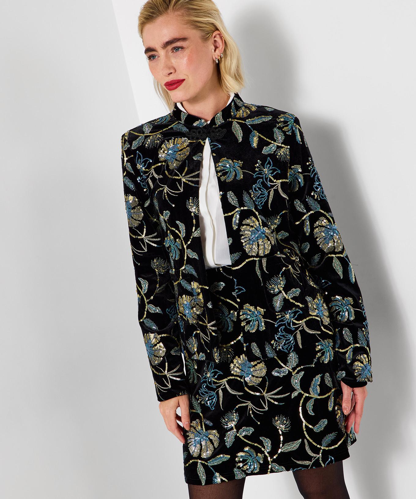 Diese Veloursjacke verfügt über eine aufwendige Stickerei, die einen raffinierten und eleganten Look bietet. Das Design umfasst einen Stehkragen und einen Frontverschluss, was sie zu einer vielseitigen Ergänzung für jede Garderobe macht.