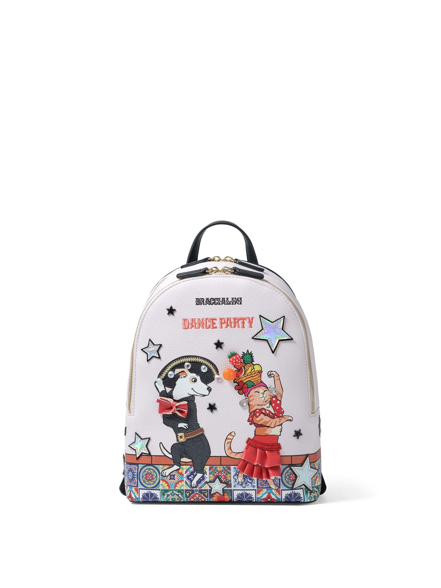 Dieser Ariadne Rucksack präsentiert ein verspieltes "Dance Party" Design mit zwei tanzenden Tieren, eines mit Sombrero und das andere mit einem Fruchthut. Die Unterseite des Rucksacks ist mit einem farbenfrohen Fliesenmuster verziert, das seine lebendige Ästhetik unterstreicht. Der Rucksack ist mit einem doppelten Reissverschluss für sichere Aufbewahrung und verstellbaren Schultergurten für bequemes Tragen ausgestattet.
