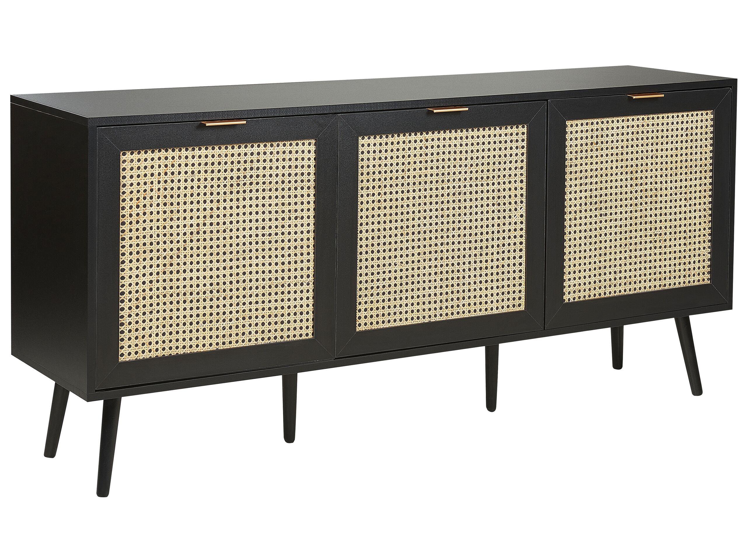 Stilvolles schwarzes Sideboard mit Rattanfronten. Dieses Sideboard ist die perfekte Ergänzung für jeden Raum, sei es im Wohnzimmer, Schlafzimmer oder Flur. Mit drei modernen Rattan-Türen, hinter denen sich reichlich Stauraum verbirgt, kann es als Aufbewahrungsort für Geschirr, Bücher, Sammlerstücke, Kleidungsstücke und vieles mehr dienen. Getragen von robusten Beinen aus Gummibaumholz und verziert mit eleganten goldenen Griffen, vereint dieses Möbelstück Stil und Nutzen, und wertet jedes Zuhause auf.