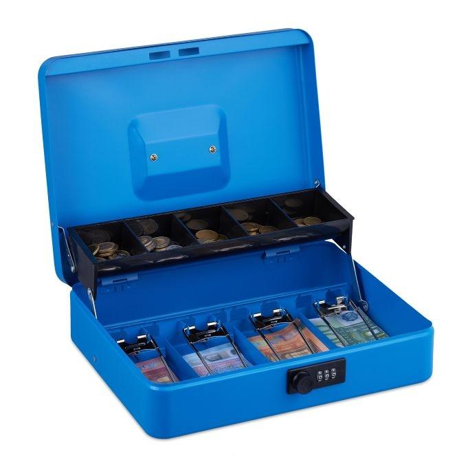 Kleine Geldkassette für Münzen und ScheineWenn Sie Bargeld sicher aufbewahren möchten, ist diese Geldkassette die richtige Wahl. Die Geldschublade eignet sich sowohl für den Einsatz zu Hause als auch auf Flohmärkten, Messen und anderen Veranstaltungen. Münzen können Sie in den 5 Münzfächern und Banknoten in den 4 Geldscheinfächern nach Wert sortieren, sodass Sie stets den Überblick behalten. Die Geldschublade ist mit einer 3-stelligen Zahlenkombination gesichert und lässt sich am Tragegriff bequem transportieren.