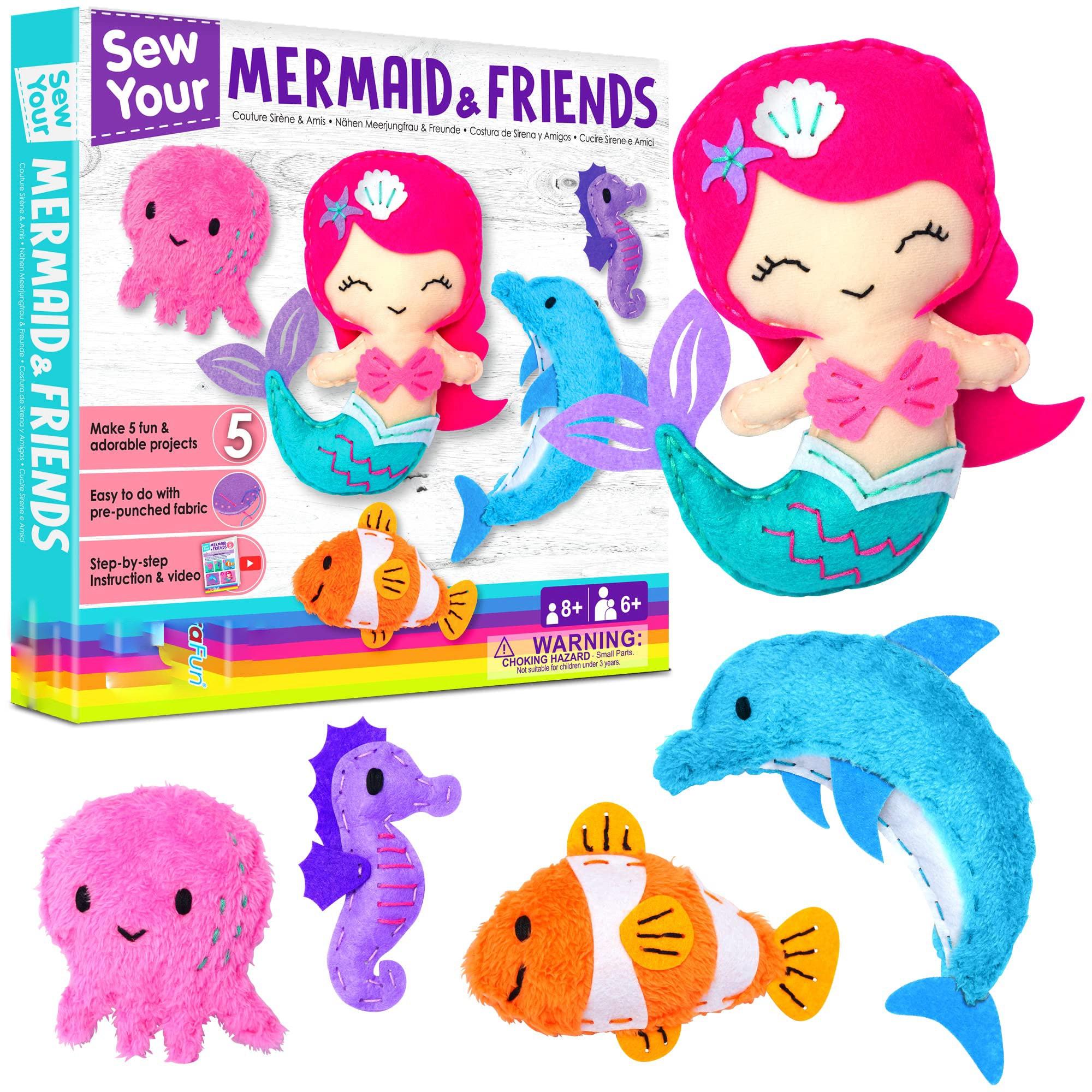 Kommt mit wiederverwendbaren und schönen Box für alle Handwerksmaterialien. Eine großartige Möglichkeit, Anfänger in das Erlernen von Kunsthandwerk einzuführen! Basteln Sie insgesamt 5 Plüschpuppen, darunter eine Meerjungfrau, einen Delfin, ein Seepferdchen, einen Clownfisch und eine Krakenpuppe. Werkzeuge und Anleitungen für dieses Kinderhandwerk sind ebenfalls enthalten. Ein tolles Geschenk für Kinder ab 7 Jahren, die weiche und flauschige Tierspielzeuge lieben! Auch Familien und Freunde können den Spaß teilen. Lernen Sie nähen, basteln und kreieren Sie Ihre süßen und lustigen Projekte! Kunststoffwerkzeuge werden mitgeliefert, um die Sicherheit der Kinder während des Gebrauchs zu gewährleisten. Alle Materialien werden aus sicheren Quellen bezogen und gründlich nach Sicherheitsstandards getestet. Kein Klebstoff erforderlich und keine Unordnung mehr! Alle Stoffe werden mit vorgestanzten Löchern und vorgestanzten Formen geliefert, die sich leicht mit Plastikwerkzeugen oder den Händen nacharbeiten lassen. Außerdem wird eine klare grafische Nähanleitung mitgeliefert. Größe-25.0 x 25.0 x 3.0 cm