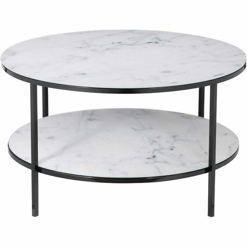 Runder Couchtisch mit 2 Tischplatte in weisser Marmoroptik und schwarzem Gestell2x 6 mm starke Glasplatte mit unterliegender Folie in Marmoroptik weiss, oben geschliffen