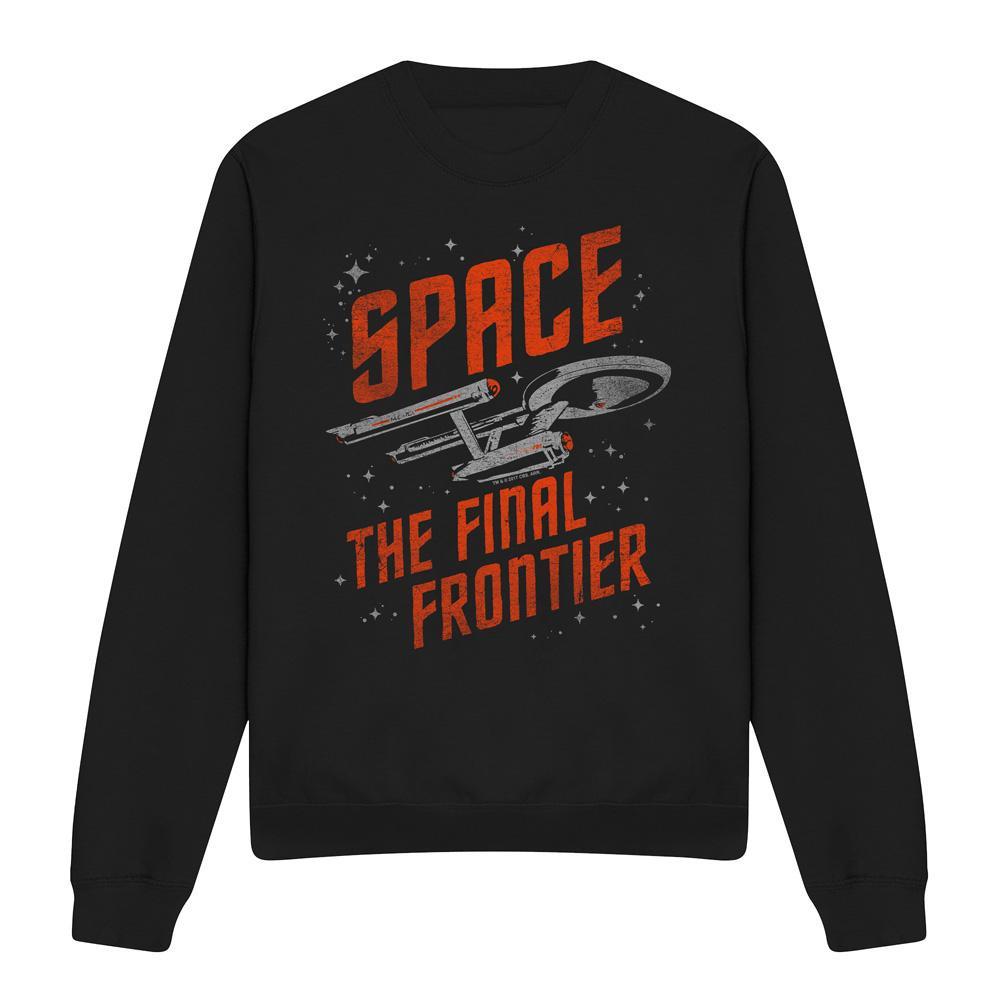 Dieses Sweatshirt verfügt über ein klassisches Rundhalsdesign und lange Ärmel und bietet eine bequeme und entspannte Passform. Die Vorderseite ist mit einem Grafikdruck verziert, der "SPACE THE FINAL FRONTIER" zusammen mit der Abbildung eines Raumschiffs vor einem Sternenhintergrund zeigt.