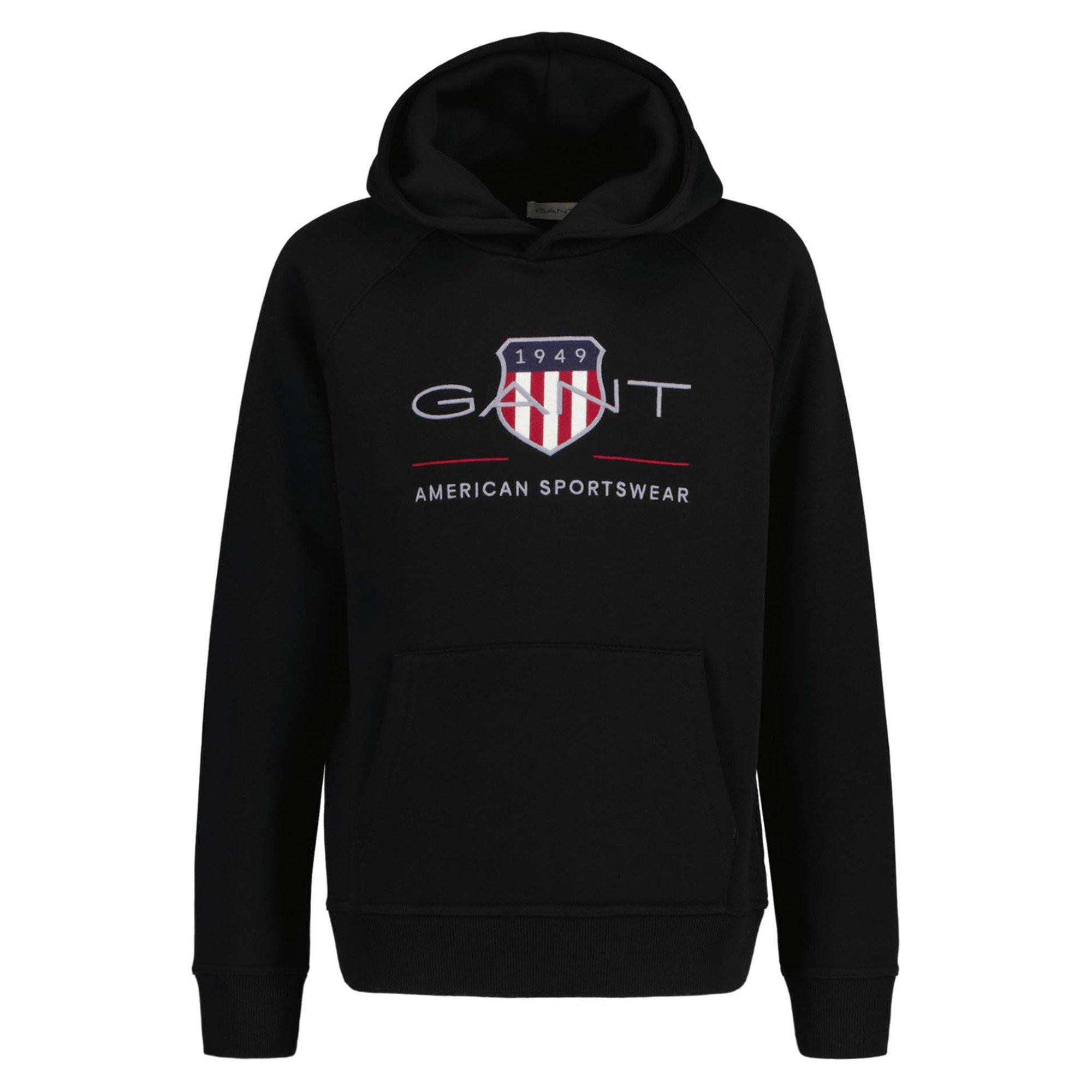 Lässiger Hoodie für Mädchen und Jungen von der Marke GANT. Sweatware aus angenehm weichem Baumwoll-Mix mit Kapuze, Känguru-Tasche und Wappen-Logo Stickerei.