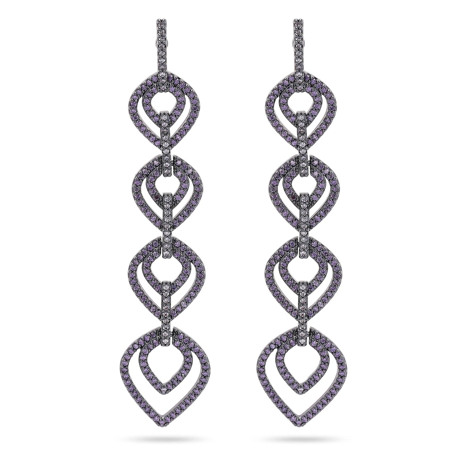 Diese eleganten, lilafarbenen Hängeohrringe bestechen durch ihr kaskadenförmiges, geometrisches Design mit rautenförmigen Schlaufen, die mit schimmernden lila Steinen besetzt sind. Die filigranen Details und die dunkle Metallfassung verleihen ihnen einen kühnen und zugleich raffinierten Look – perfekt, um Abendgarderobe oder besonderen Anlässen einen Hauch von Glamour zu verleihen. Größe: 1,5 cm x 6,9 cm | Beschichtung: Rhodiumplattiert | Verschluss: Stecker und Rückseite
