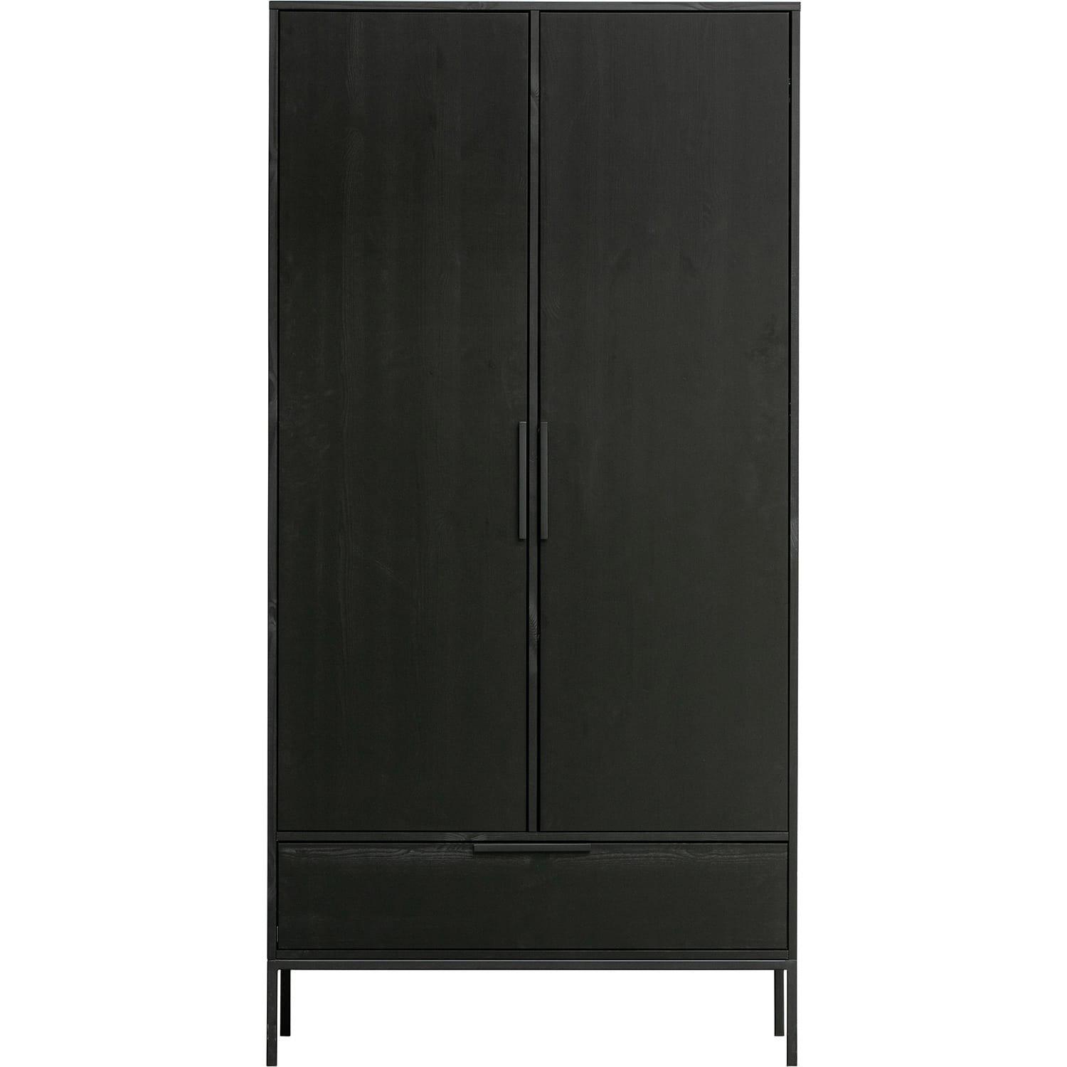 Der zweitürige Schrank Adam ist ein niederländischer Hersteller der Marke WOOOD. Der Schrank Adam besteht aus massiver skandinavischer, FSC-zertifizierter Kiefer mit Stahlboden. Das Innere des Schranks ist in der gleichen Farbe wie der Schrank lackiert und besteht aus einem Hängeteil mit einer Stange und einem Regal auf der linken Seite, auf der rechten Seite: 3 Regale mit einem Abstand von 37 cm. Die Regale sind aus Spanplatten gefertigt. Die Schublade ist mit luxuriösen Unterwagenführungen ausgestattet. Sowohl die Türen als auch die Schublade haben luxuriöse Griffe. Die Adam-Schränke können miteinander verbunden werden. Der Adam-Schrank ist in den Farben Schwarz und Stahlgrau erhältlich.