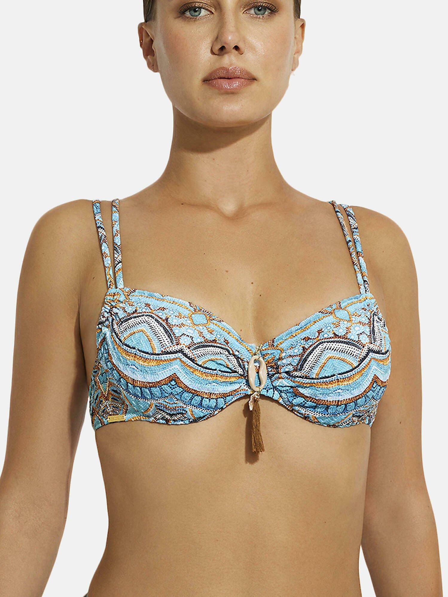 Dieses Bikini-Oberteil aus der Mai Thai Kollektion bietet grossen Halt mit einem verschachtelten Kontrolleffekt, Bügeln und ist nicht vorgeformt. Mit leichten Falten im Vorderteil bietet es Komfort und Halt am Strand und im Schwimmbad. Sein wunderschöner, leuchtender Ethno-Print entführt an die Strände Polynesiens. Die schmalen Träger sind für eine perfekte Passform verstellbar und vorne gefüttert. Ein dekoratives muschelförmiges Schmuckstück mit einer bunten Troddel befindet sich zwischen den Cups. Es wird am Rücken mit einem Clip geschlossen.