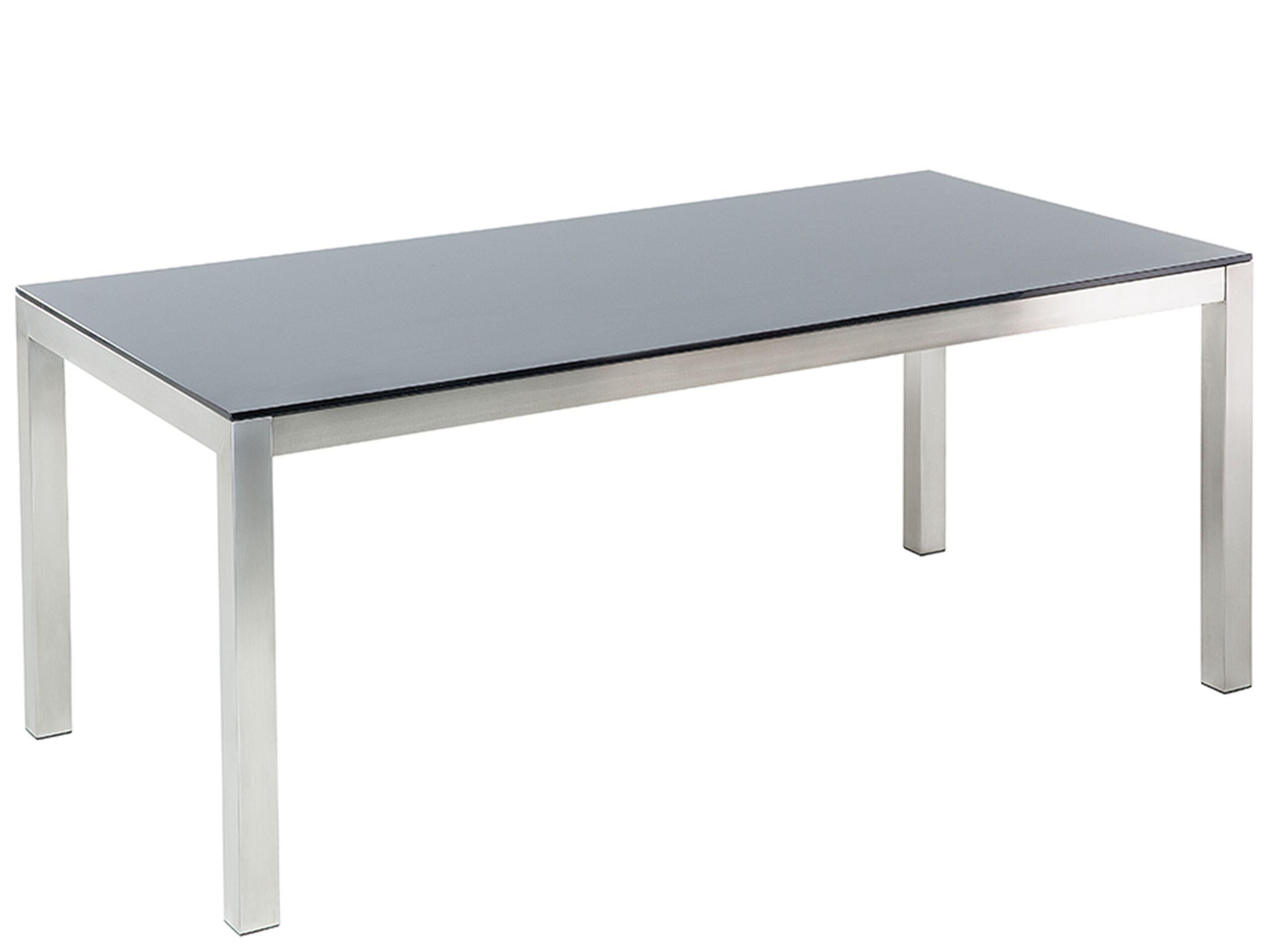 Moderner Gartentisch mit stabiler Sicherheitsplatte in Schwarz. Die trendy Glasplatte in mattem Schwarz verleiht dem aussergewöhnlichen Gartentisch eine extravagante Wirkung. Der moderne Materialmix aus Edelstahl und Glas ist perfekt auf das zeitlose, gradlinige Design abgestimmt. Das korrosionsfreie Gestell und die Tischbeine sind aus strapazierfähigem, stabilem und gebürstetem Edelstahl gefertigt und haben einen rutschfesten Stand. Die perfekt bündig aufliegende Milchglasplatte besteht aus weiss eingefärbtem Sicherheitsglas und verfügt zu Ihrer Sicherheit über flache Kanten.